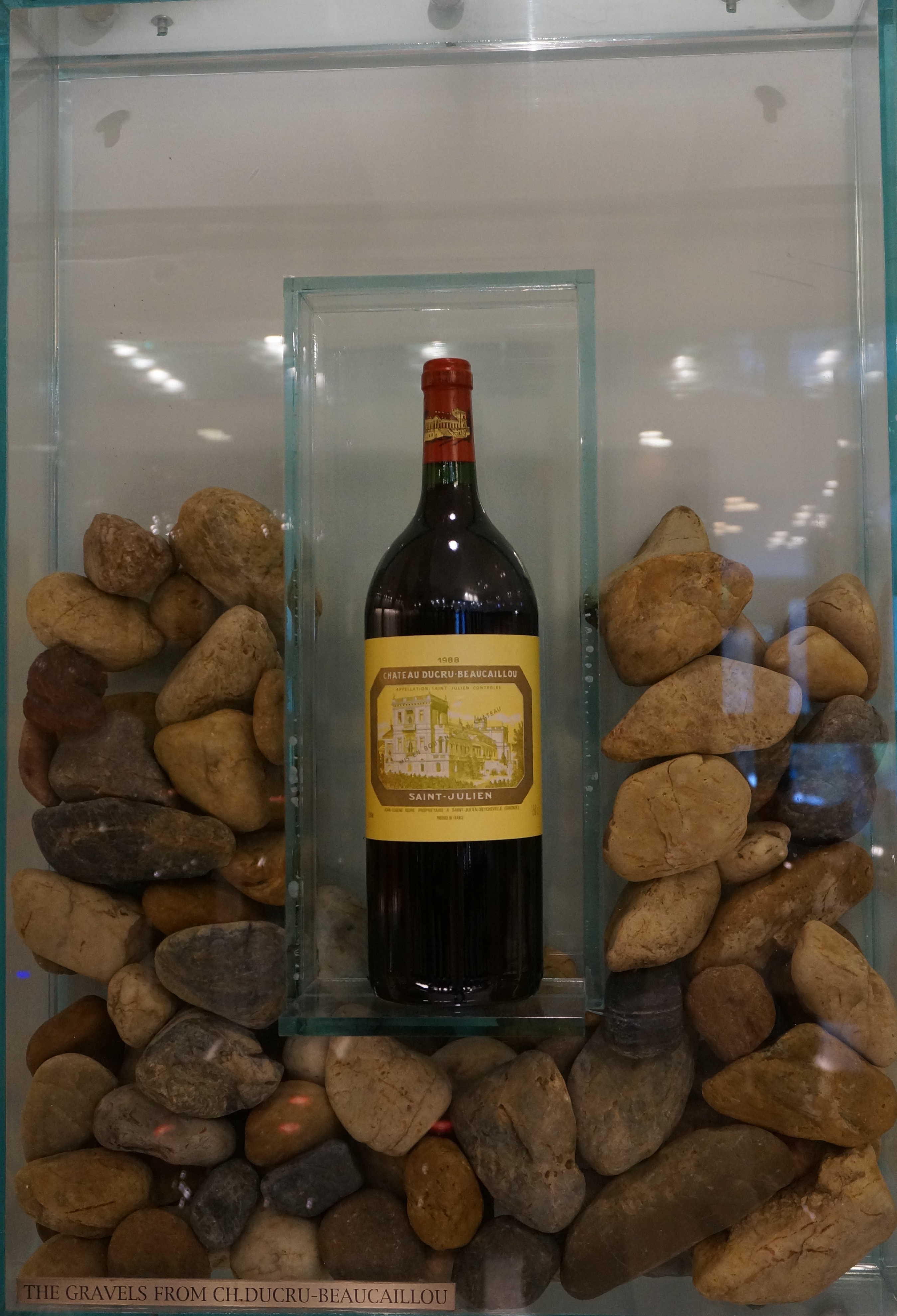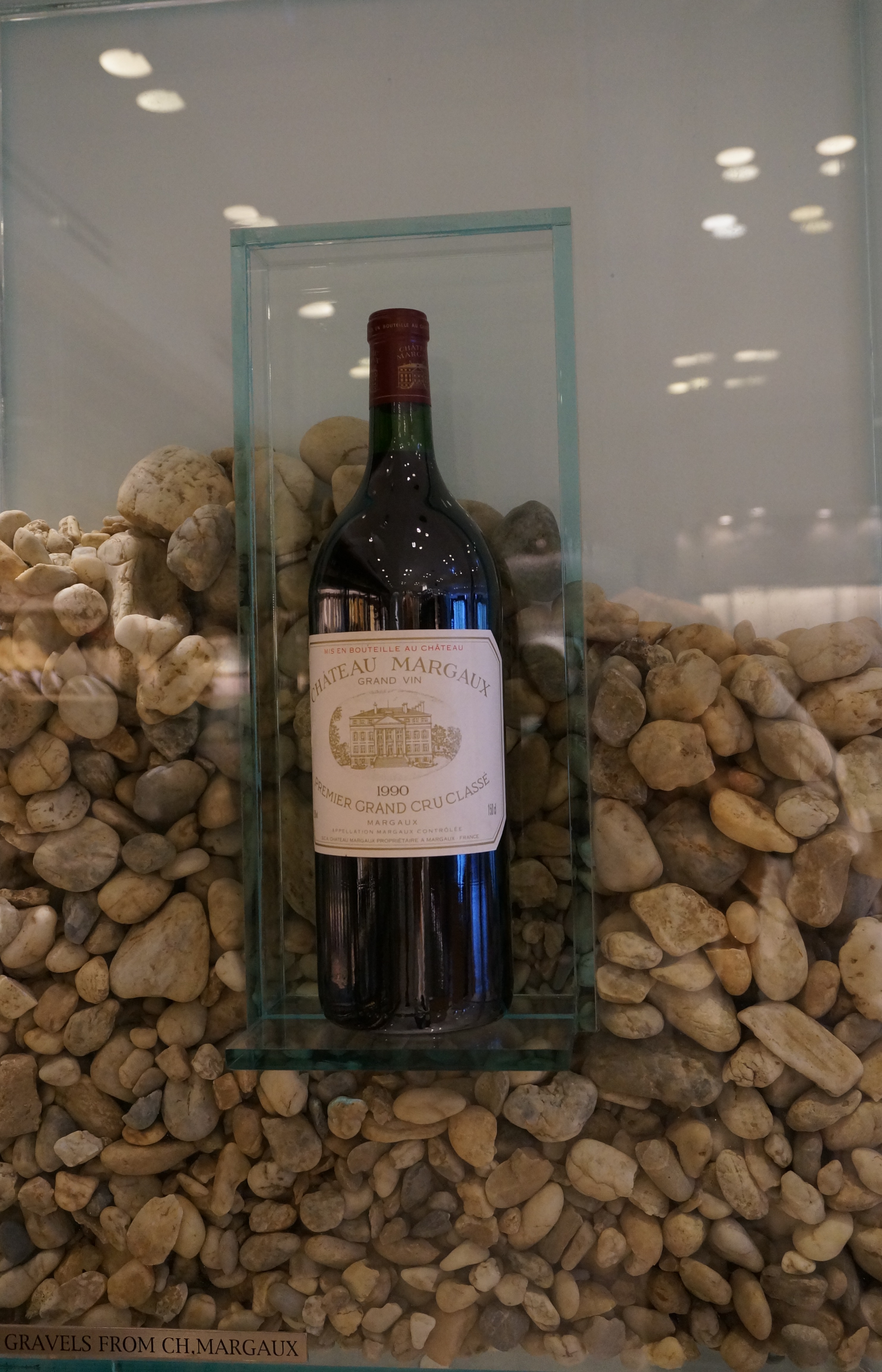 - シャトー・マルゴーのボトルと、畑に存在する多くの砂利石。