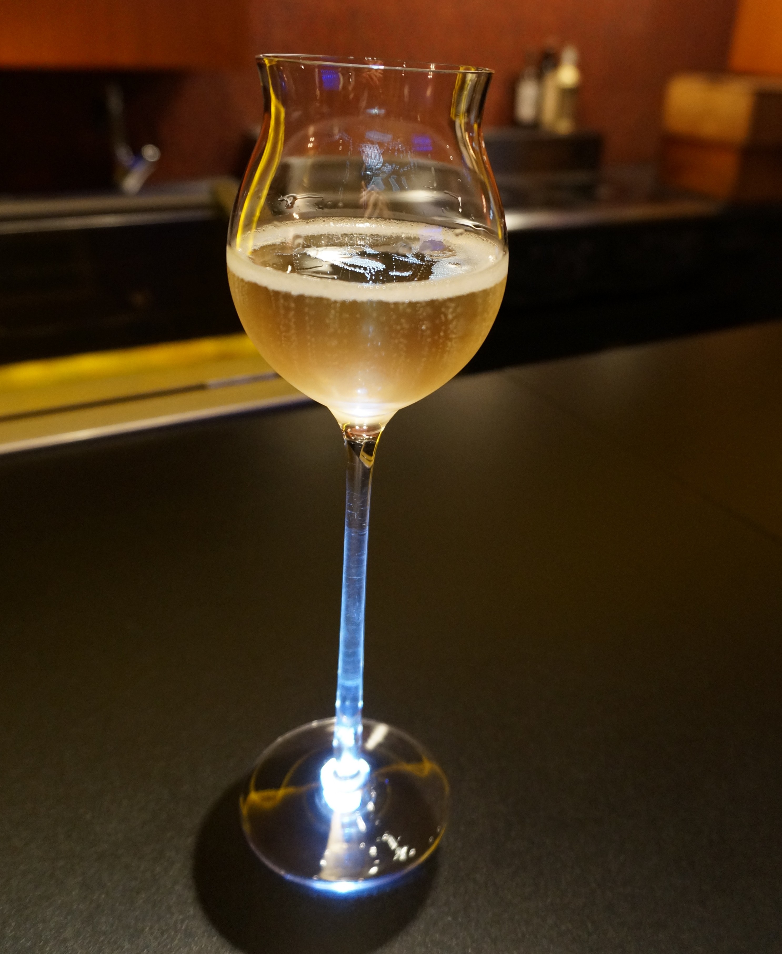 - 田崎氏デザインのグラスにシャンパーニュ。それをカウンターのこの位置に置くと、グラスの脚を通って光が泡をきらめかせる、という仕組み!