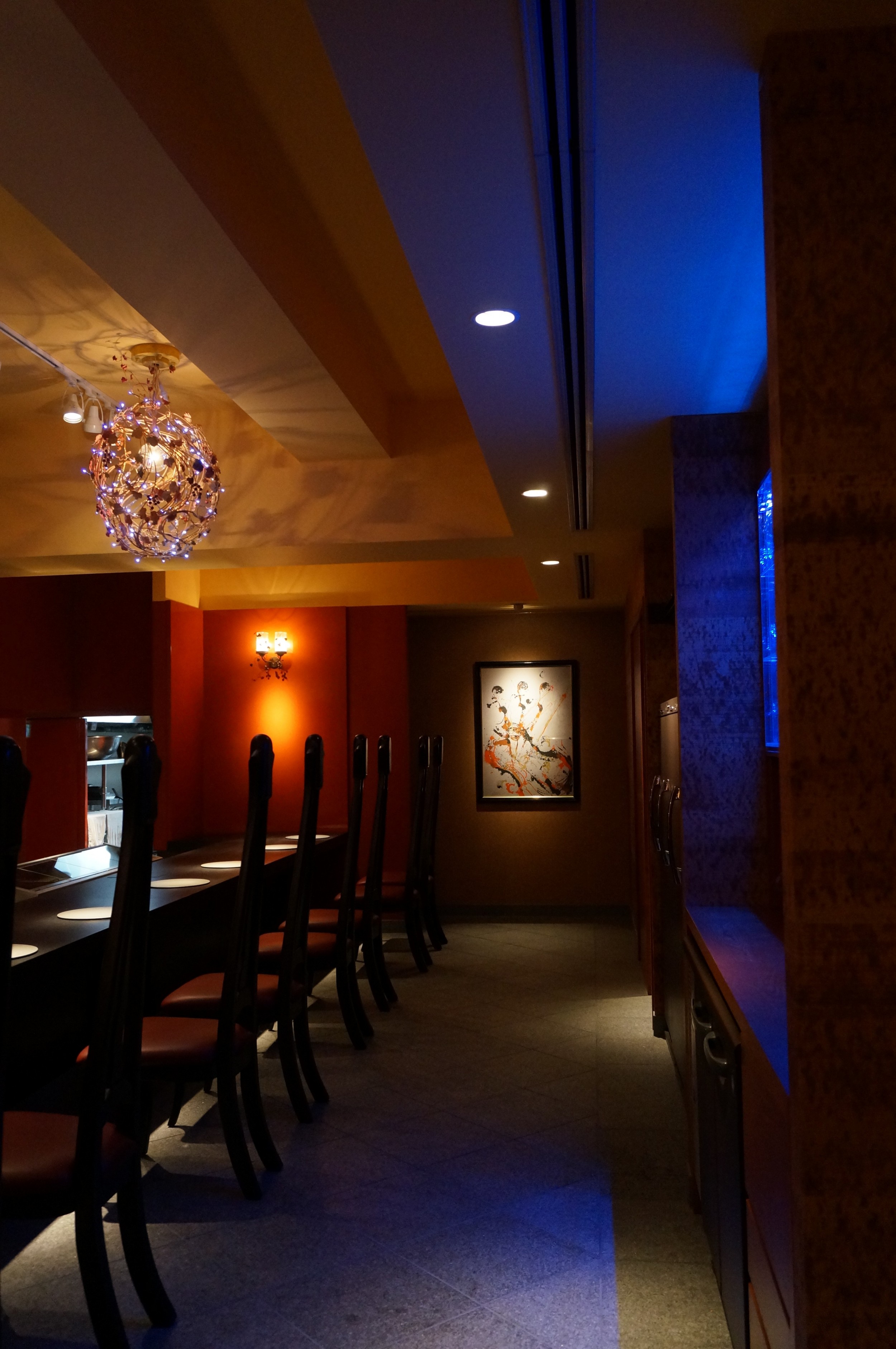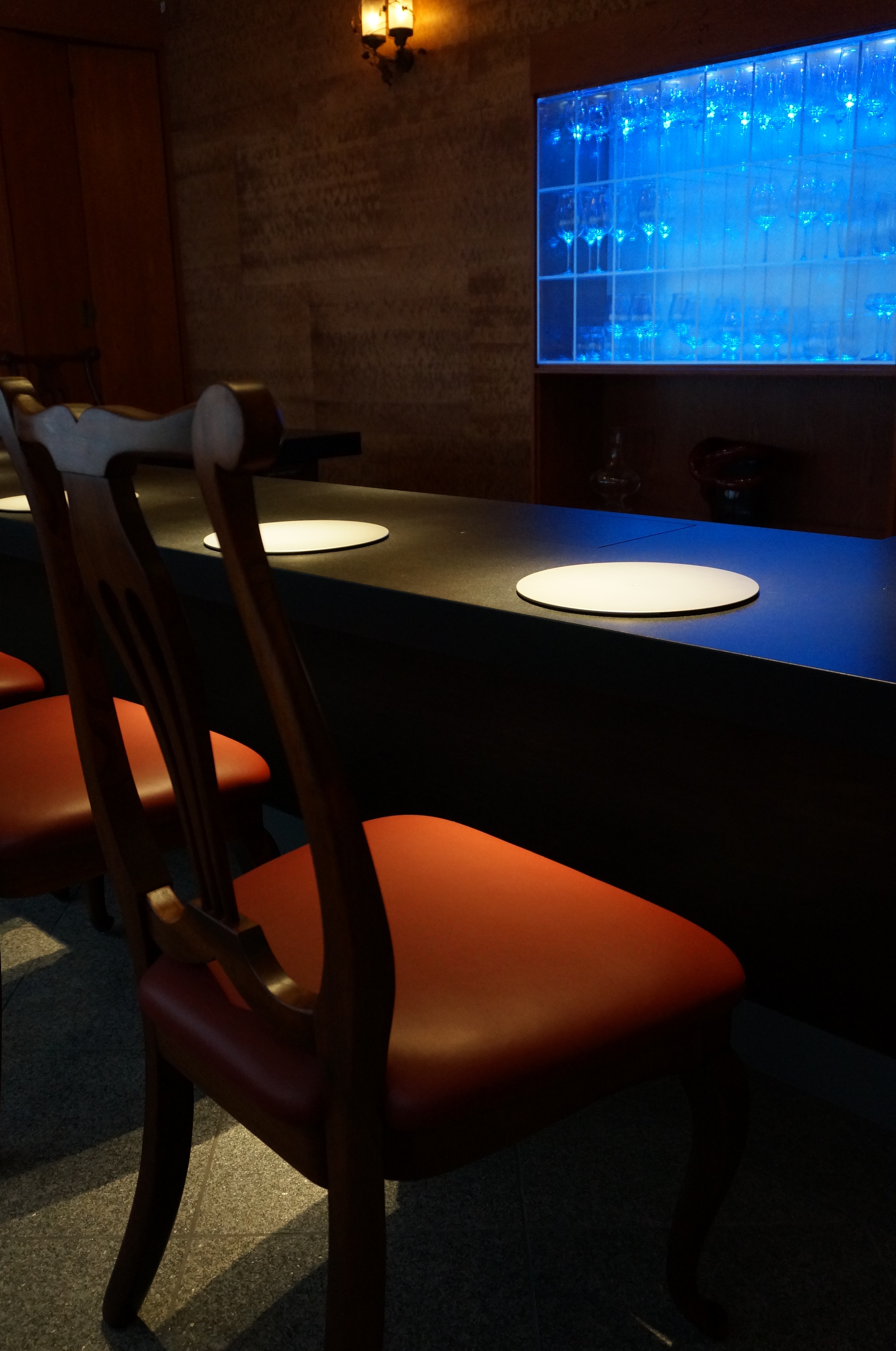- シックなカウンターのみの内観。右手のブルーの光の場所には数々のグラスが揃っています。