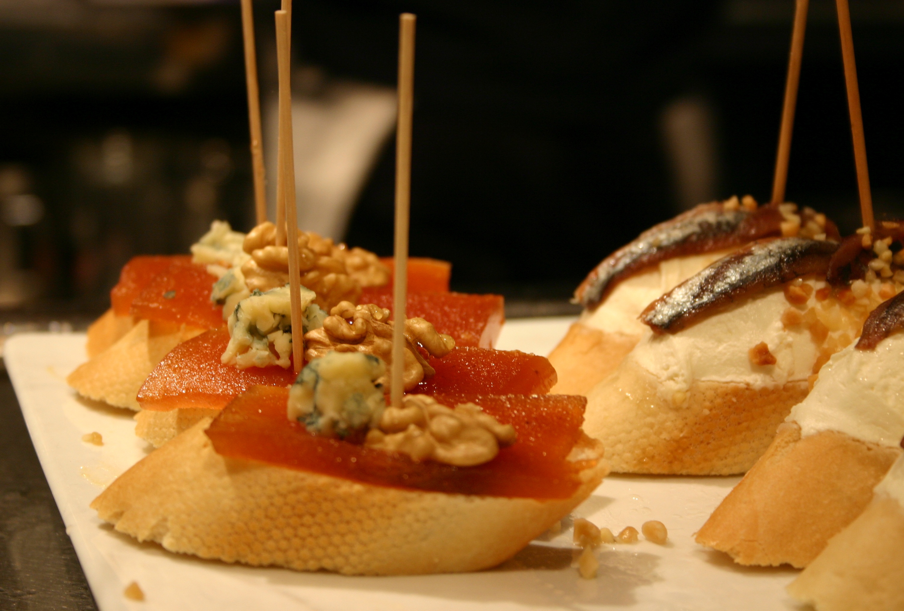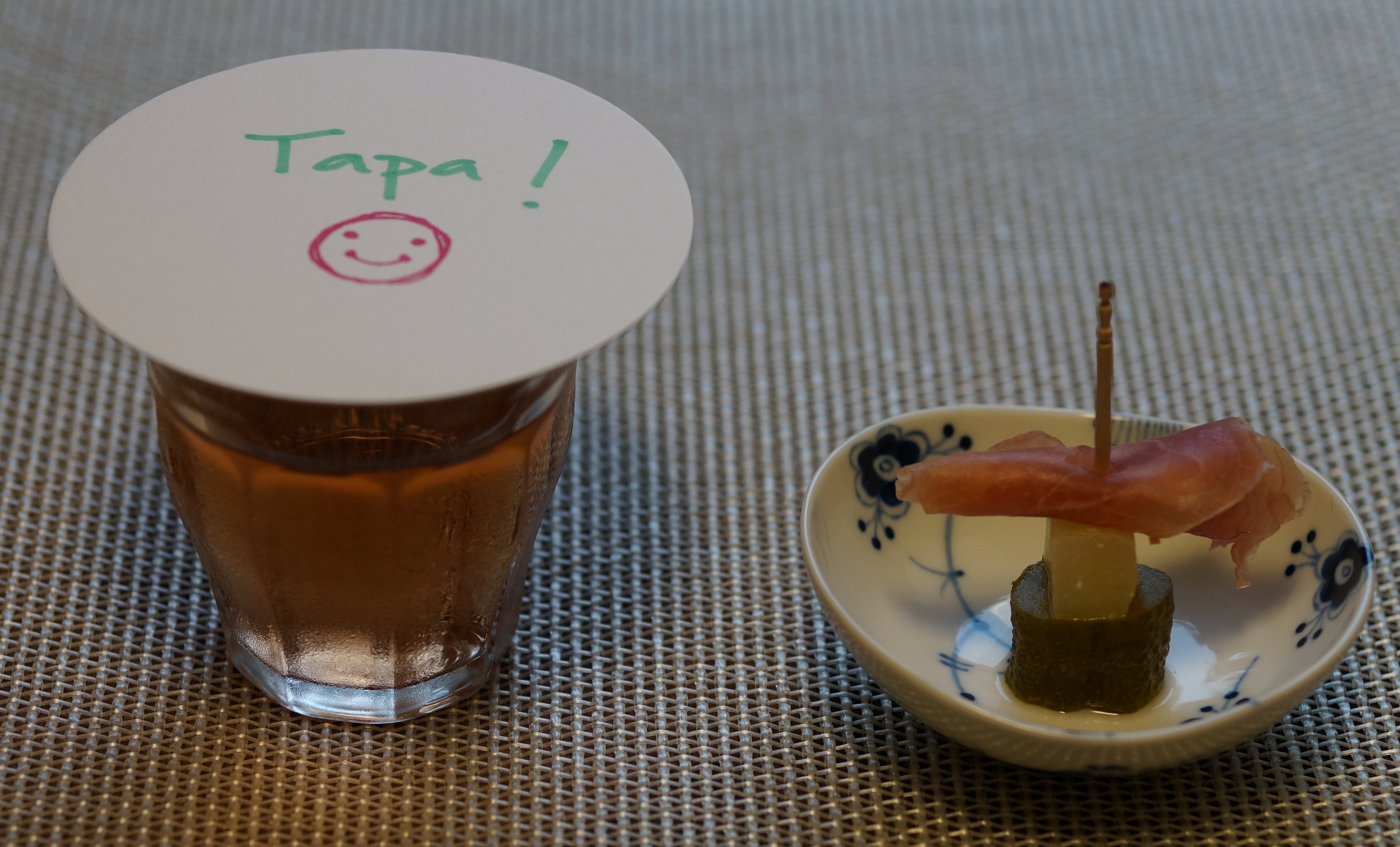 スペインでは、エピソードとして「アルフォンソ10世(13世紀在位)が『お酒を出す店は、必ず食事も出さなければいけない』という勅令を出したらしい」と語り継がれているほど、ワインには食べ物がつきものだとされているようです。そして、ちょっとした合間にホコリなどが入るのを避けるために、ワイングラスの上に、生ハムはチーズで蓋をしていたとか。それから派生して、タパ(蓋)→小皿→小皿料理→複数形になってタパス、と変化したのでした。