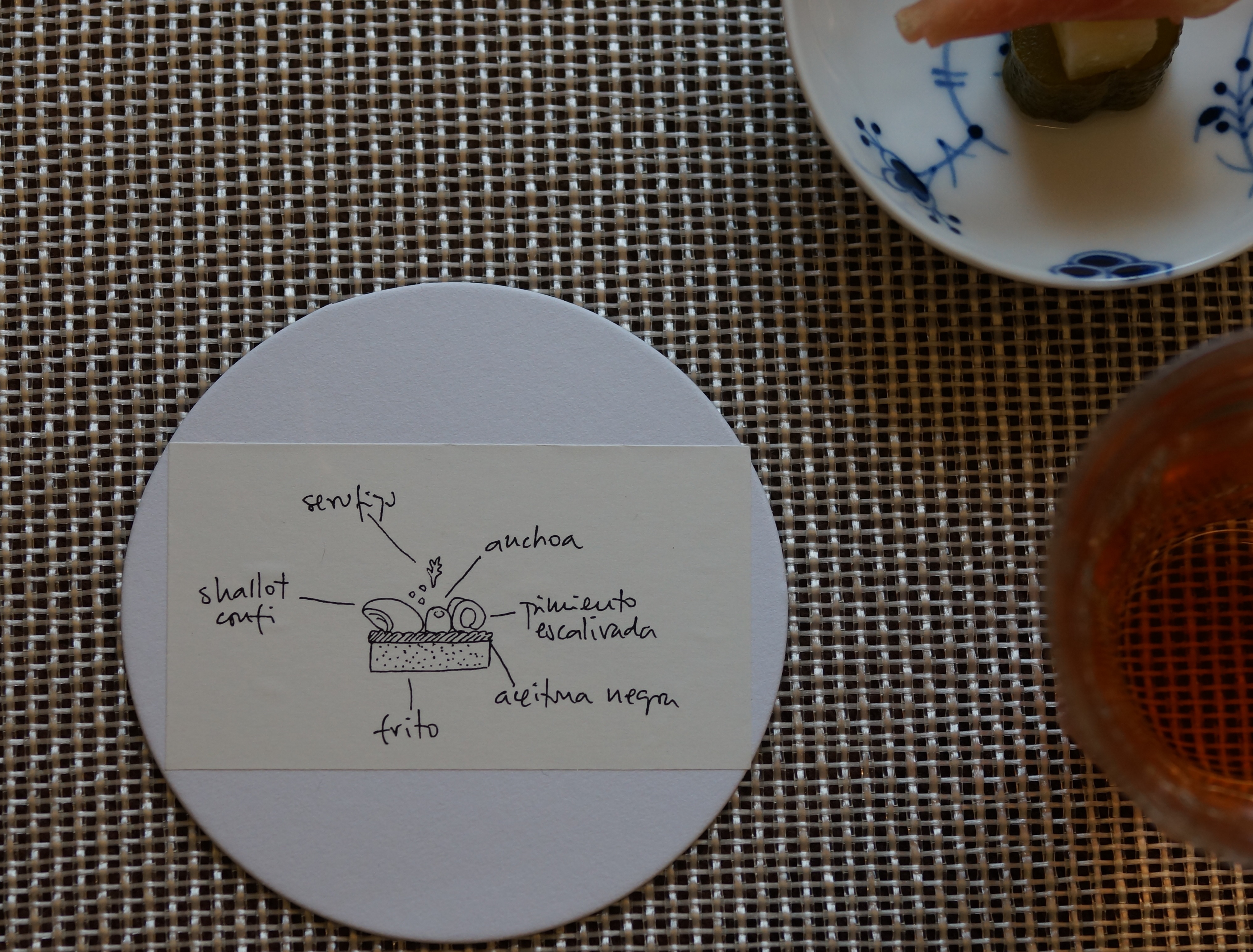 - ホセさんのピンチョスのデッサン。揚げパンの上に、黒オリーブペーストを塗り、赤ピーマン、アンチョビとオリーブ、タマネギをのせて、、、。