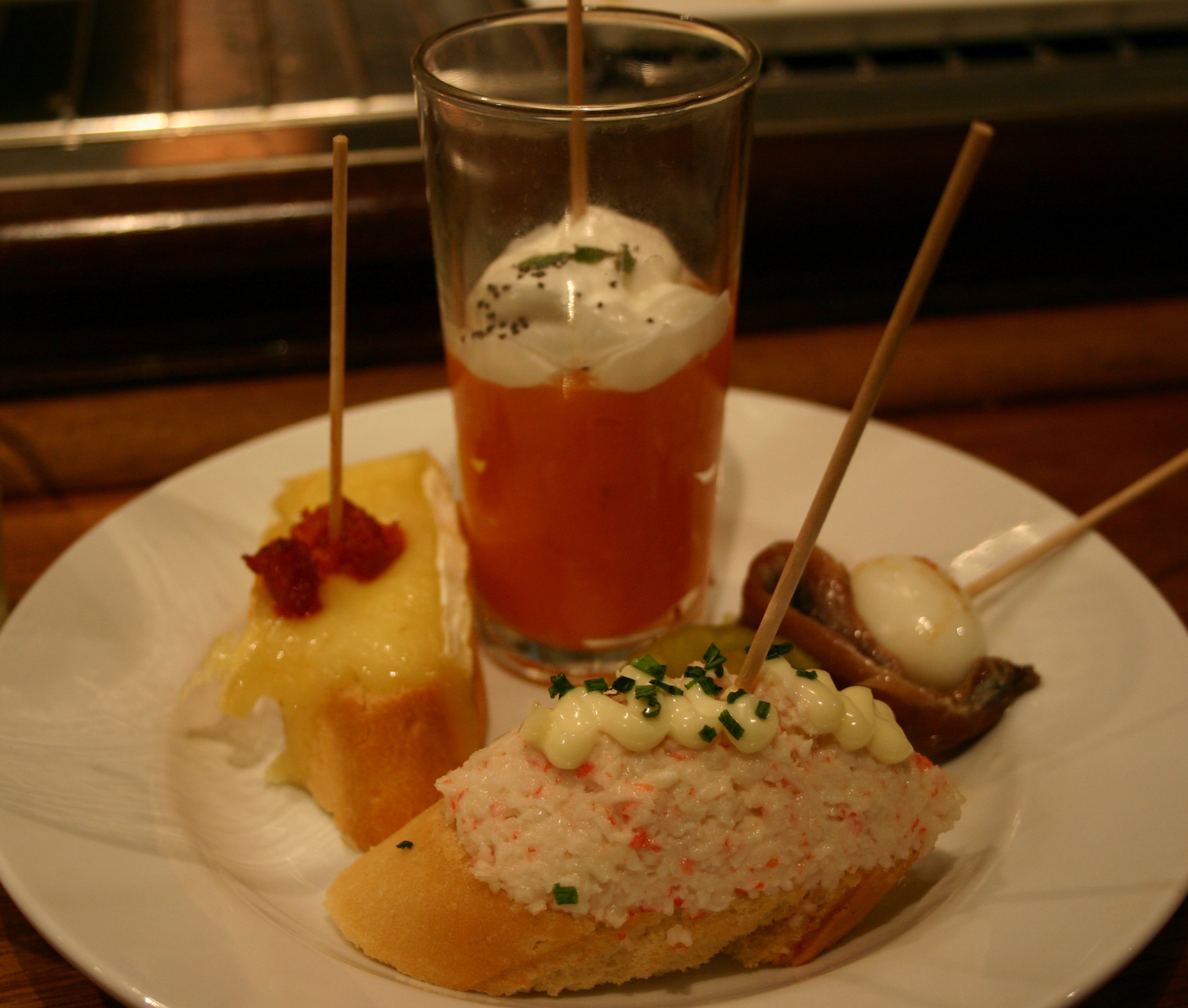 そもそものピンチョス発祥は、スペインの北東部、バスク地方のサン・セバスチャン村にあるバー「ベルガラ」。オリーブと青唐辛子とアンチョビ、つまり瓶詰め食材を楊枝で刺して出したのが最初で、今ではこの組み合わせを「ギルダ」と呼んでいます。さて、この「組み合わせて串に刺す」というのが重要なピンチョスの条件だといいます。