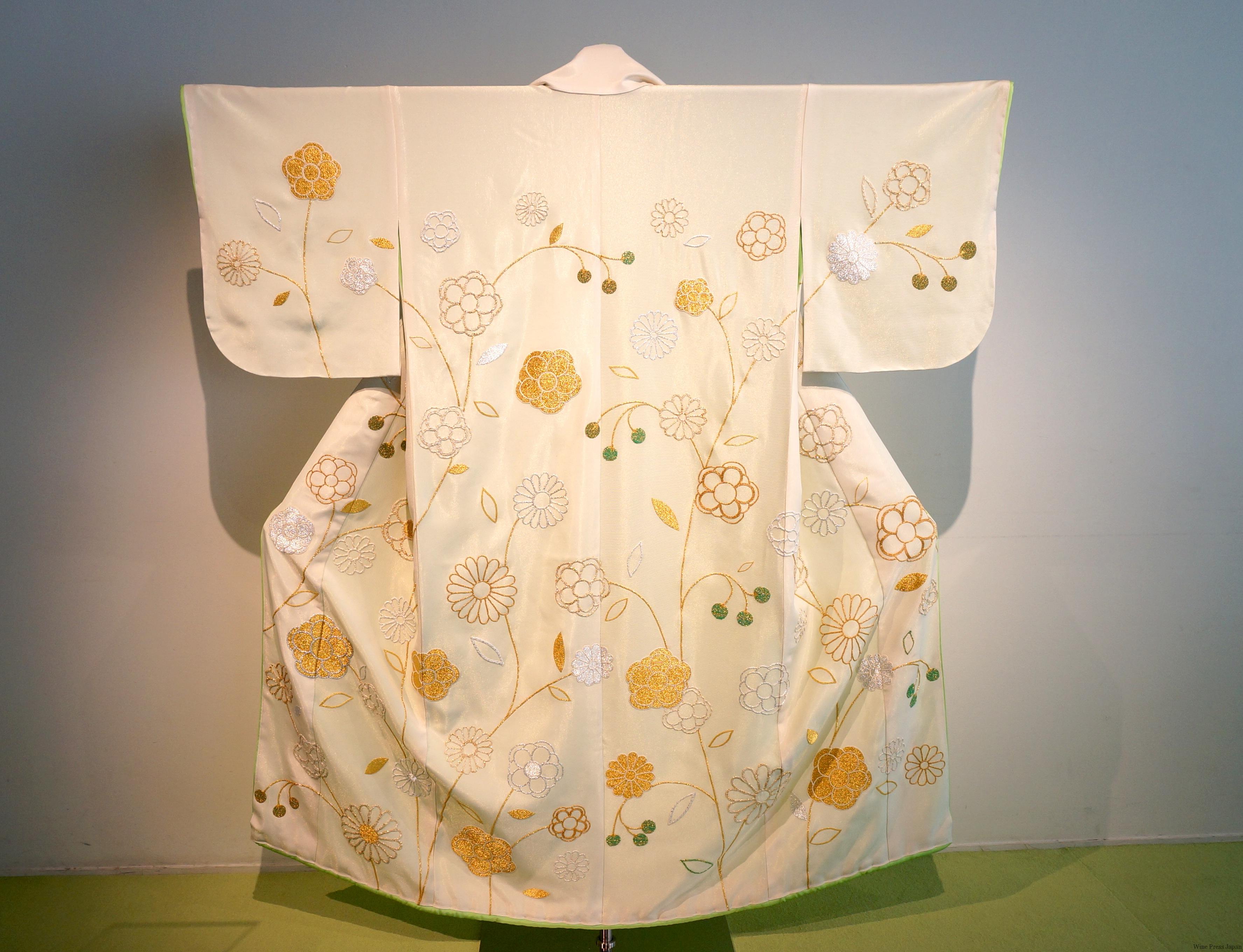 さっそく初日に覗きに行かせていただきました! ペリエ ジュエのシンボルカラーの黄緑色や「秋明菊」が映えるとても綺麗な空間で、椅子やテーブルのデザインも素敵です。妹島和世さんのお着物も、黄緑、金、白で清楚な花が描かれています。この中にいると、少し早めに春の雰囲気を楽しめそうでウキウキした気持ちになります。