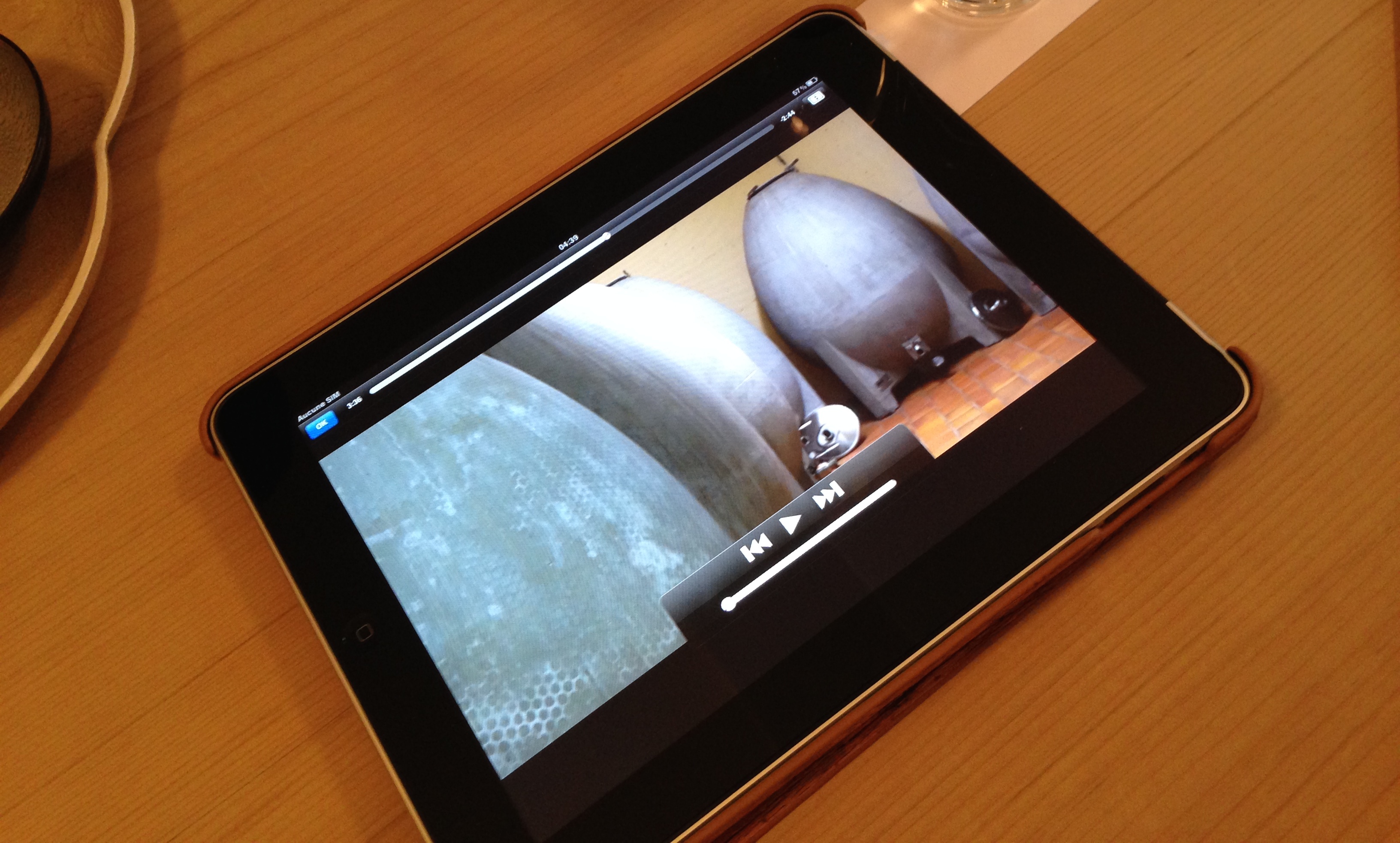 ベルナール・カヴェさんは、自分のドメーヌ「ベルナール・カヴェ」を運営する傍ら、友人でイヴォルヌ村の村長を務めるフィリップ・ジェックスがオーナーの「ドメーヌ・ド・ラ・ピエール・ラティネ」の醸造アドバイスもしています。彼がiPadを取り出して見せてくれたのが、最近特に有機栽培やバイオダイナミクスを行う造り手がよく使っている卵形のコンクリートタンクでした。2006年から使い始めていて気に入っているようです。
