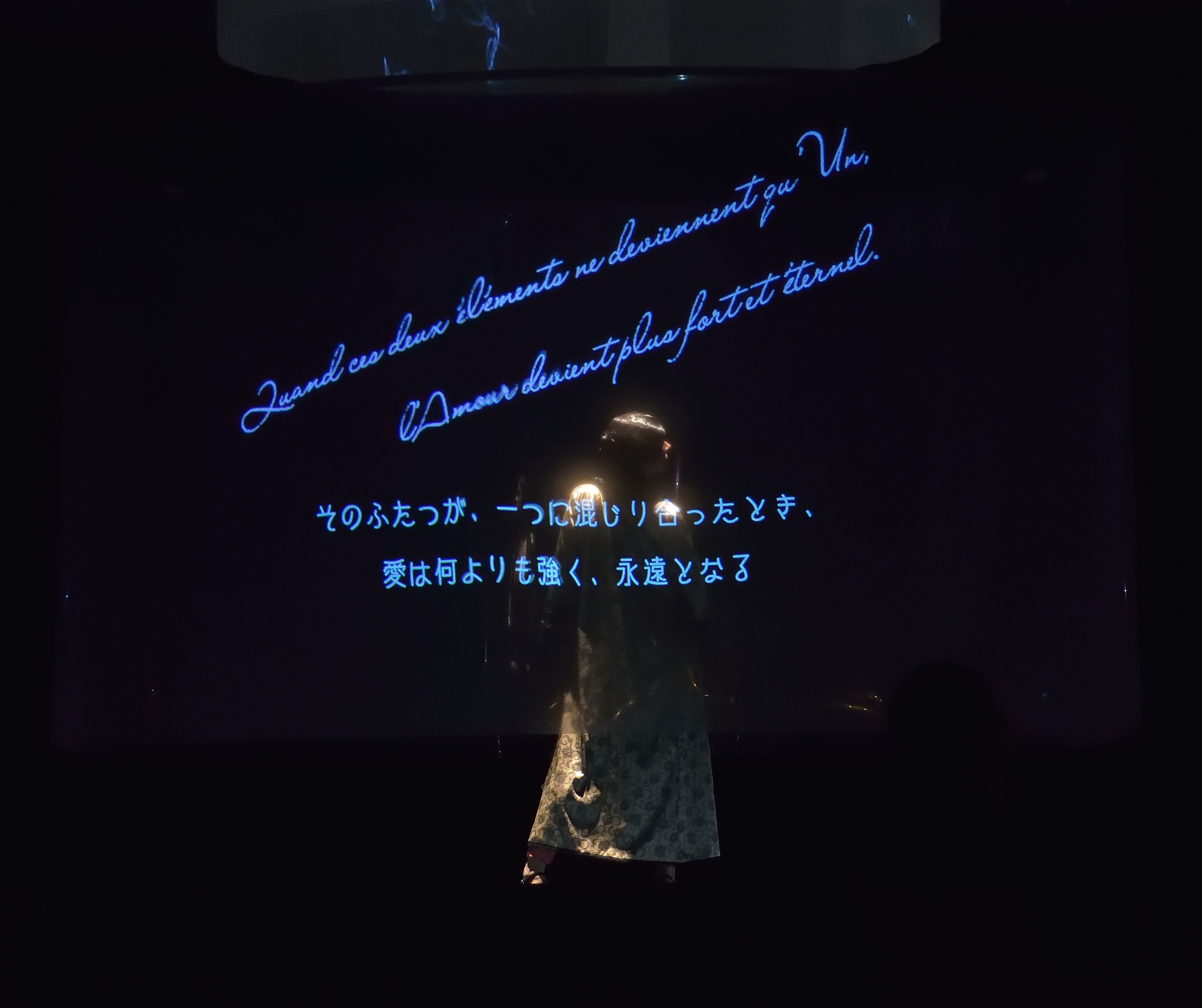 マタ・ハリ、このプロジェクトのお話を聞くまで、名前は知っていたが詳しくは知らなかった。が知ってみると、語り継がれるだけあるなと思い、大変興味を持ちました。それはなぜなら、マタ・ハリはドイツ軍、フランス軍ということに関係なく、真剣に生きた女性であったと感じたから。ハリウッド映画や色々なものを見てもやはり、彼女は真剣に 愛を大切にしていたと思った。だから単なるスパイではない。もちろんエンターテイナーとしてダンスをしたり、それもまた国を超えてジャワの踊りだったり、世界を混ぜ合わせて文化も交流させる、そしてもしかしたら国同士をもスパイという形ではあるけれども交流させていった女性なのではないか。彼女は孤独な人生を送ったかもしれないが、自分の生き方というものがしっかりあったのではないかと。今回は最後、全部 映像で彼女が天昇する様、どれほど彼女が美しく愛に生きたかということを表現している。