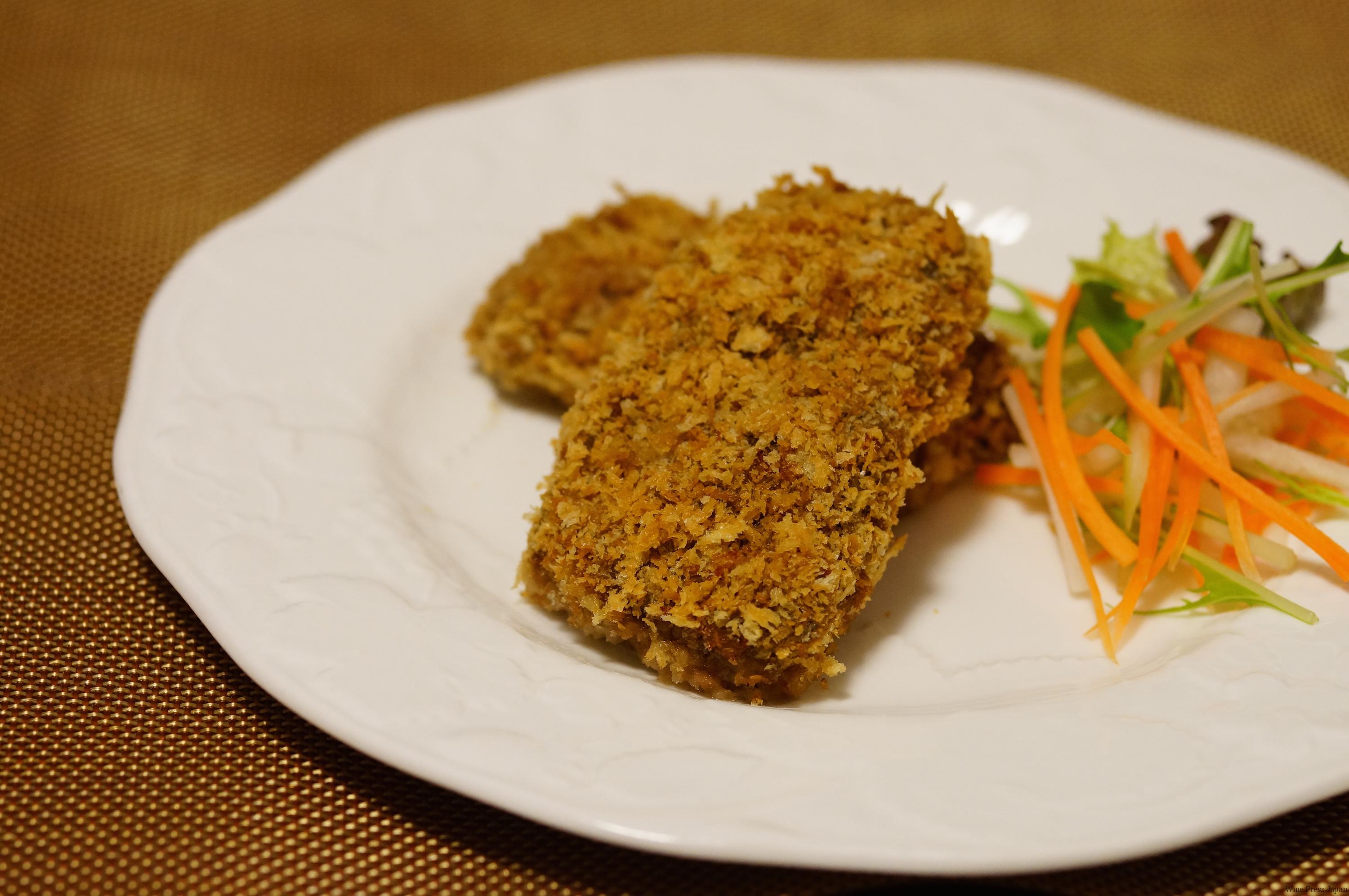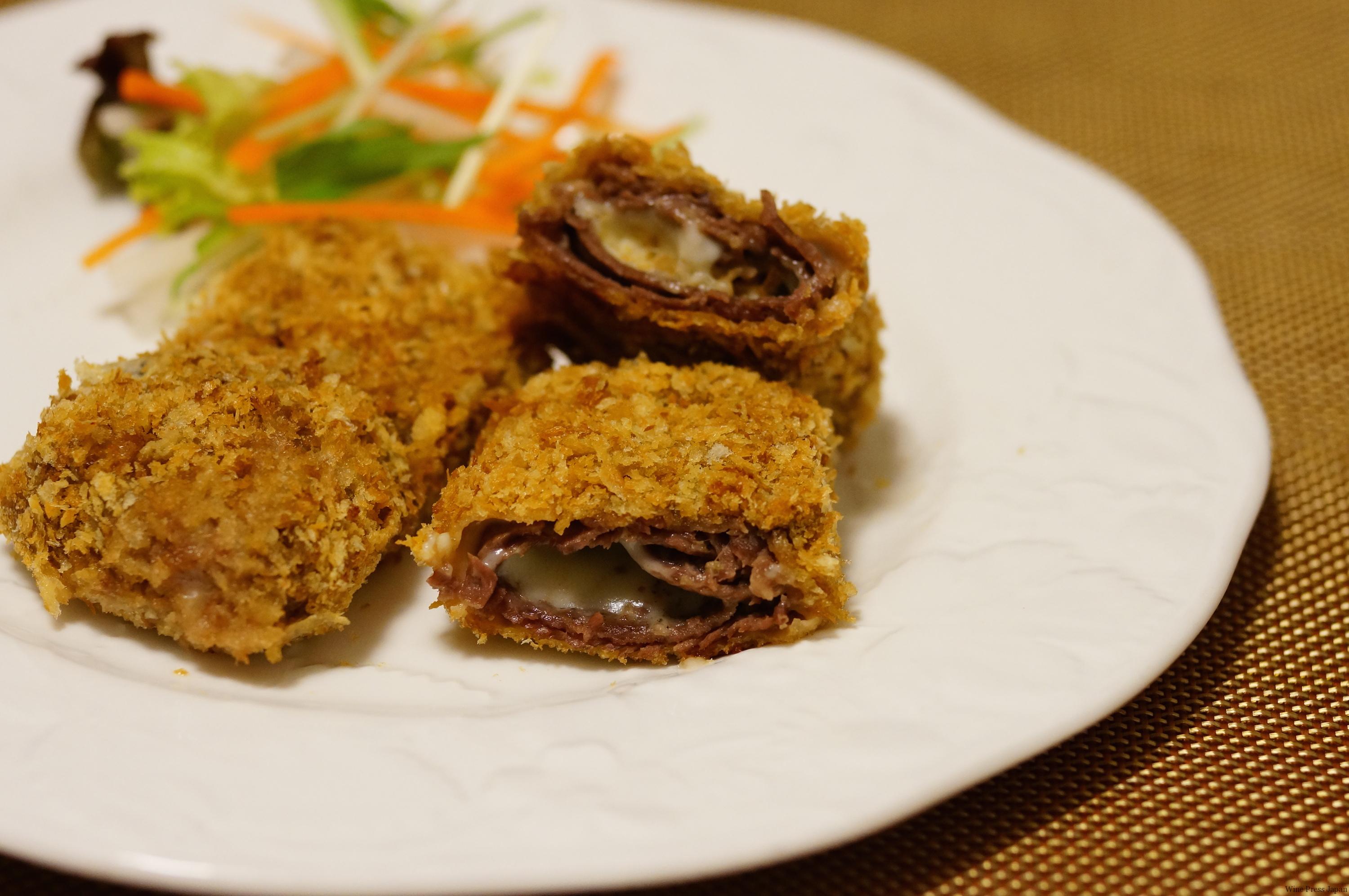 本来牛ステーキでも食べたくなるような赤ワインを目の前にして、肉じゃがに変身しては気分が保てません。そこで、薄切りの牛肉を重ねてみました。とろけるスライスチーズを乗せて巻き込んで、長方形に成形する。あとは揚げないトンカツの要領で、オーブンでこんがりと。こうすると、見た目は普通にカツレツですが、切り分けるとカツの中からチーズがとろ〜り。温かいうちに切ってくださいね。