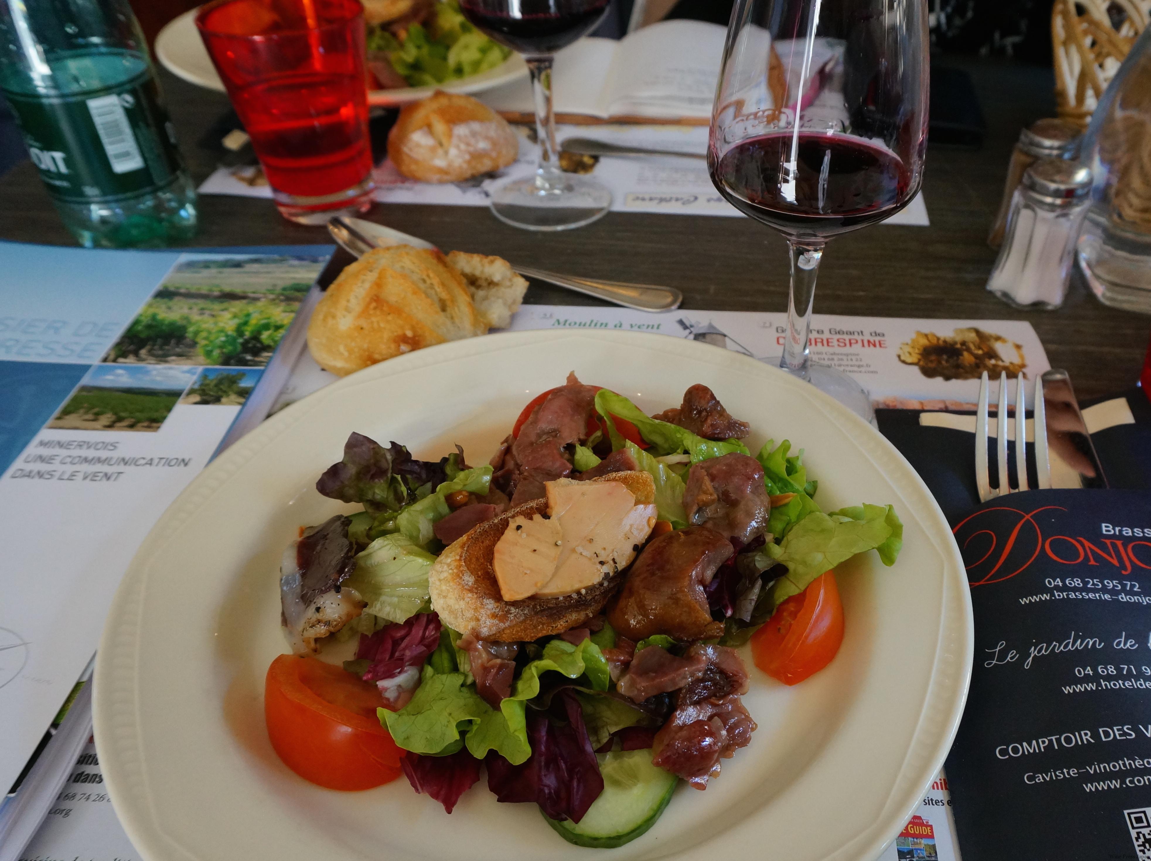- ある日のランチの一皿目。サラダの上には、砂肝とフォアグラ! 名産地が近いので、フォアグラもよく出てきました。