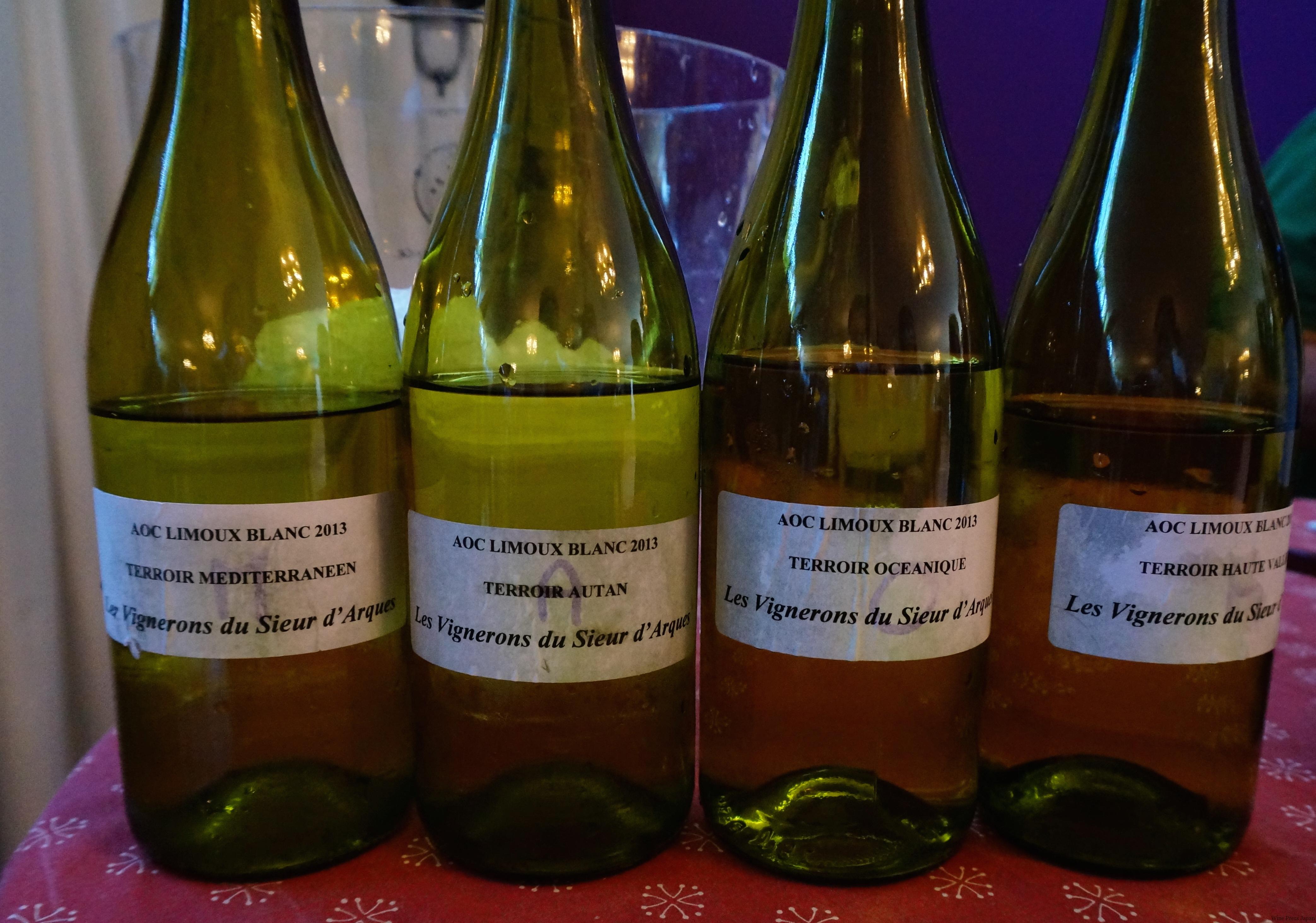 例えば、ちょうどカルカッソンヌの西側にあるワイン産地「リムー」は、スパークリングワインでとても有名ですが、今では品質の高いスティル・ワインの白と赤も生まれています。リムーの最大手「シュールダルク」の白ワイン(2013年産のサンプル)を、気候条件別に試飲させてもらうと、こんな風にちがいました。