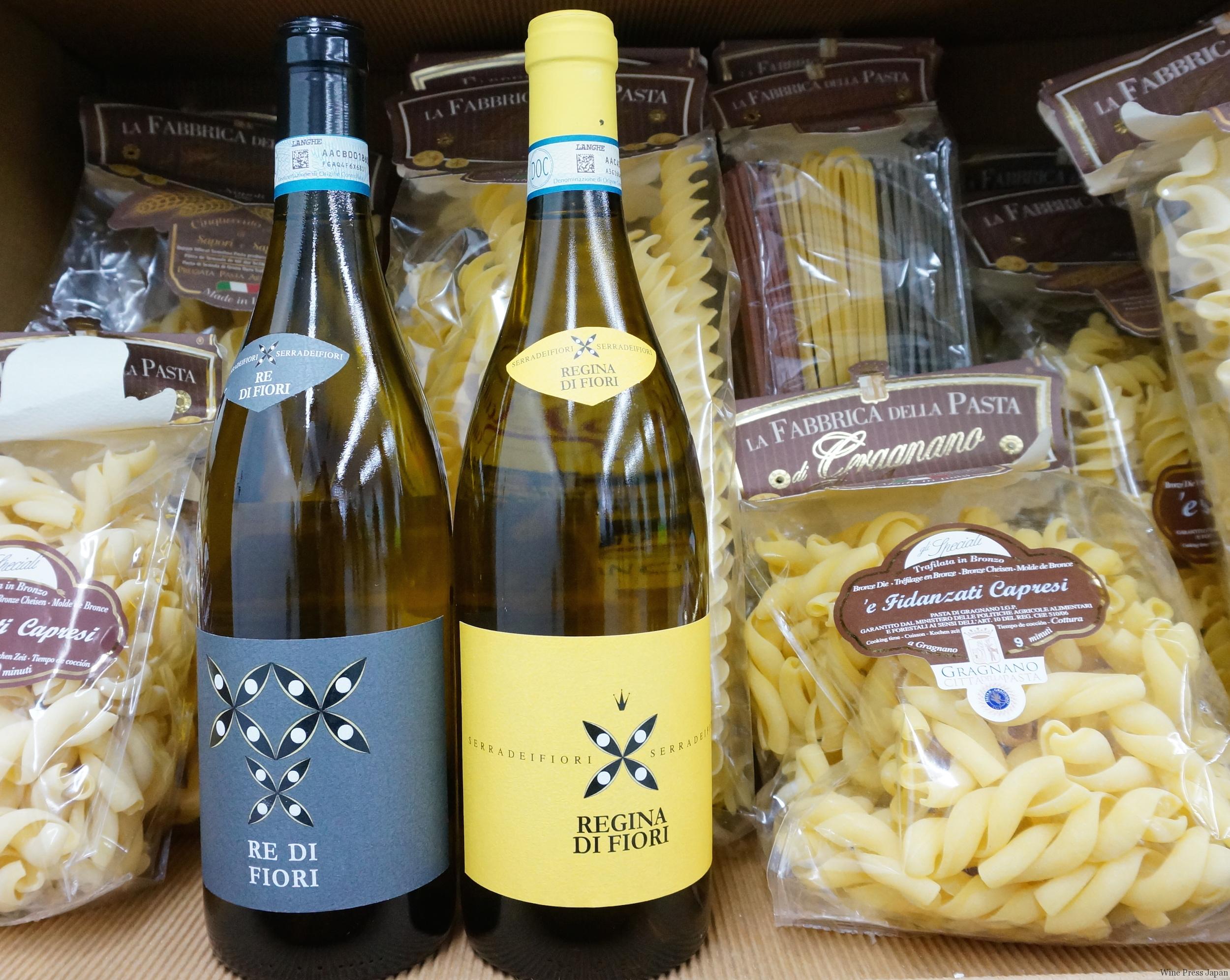 - 白2種。ナッシェッタ100%の「レジーナ・ディ・フィオーリ」(右)と、リースリングで造られる「レ・ディ・フィオーリ」。