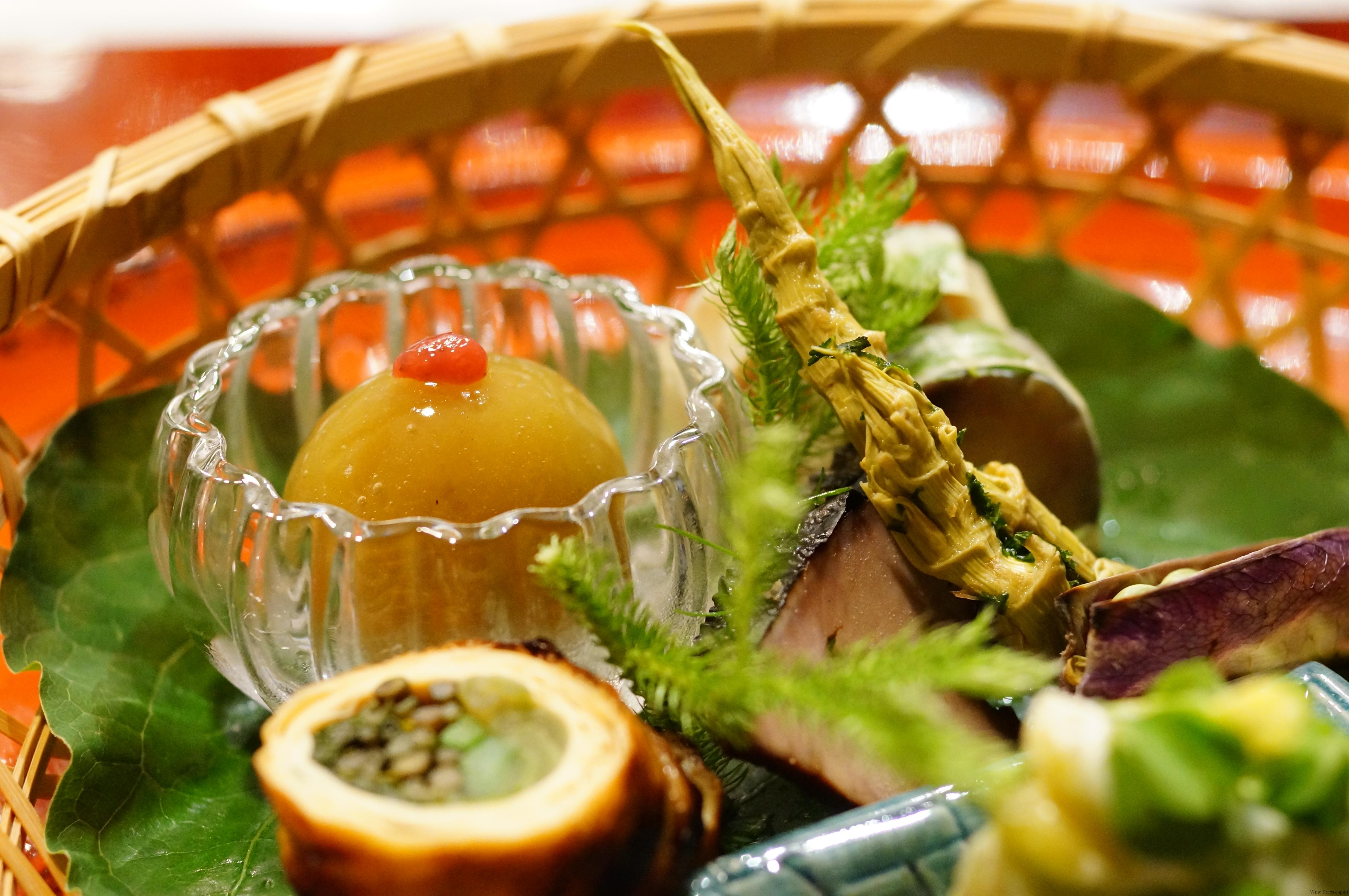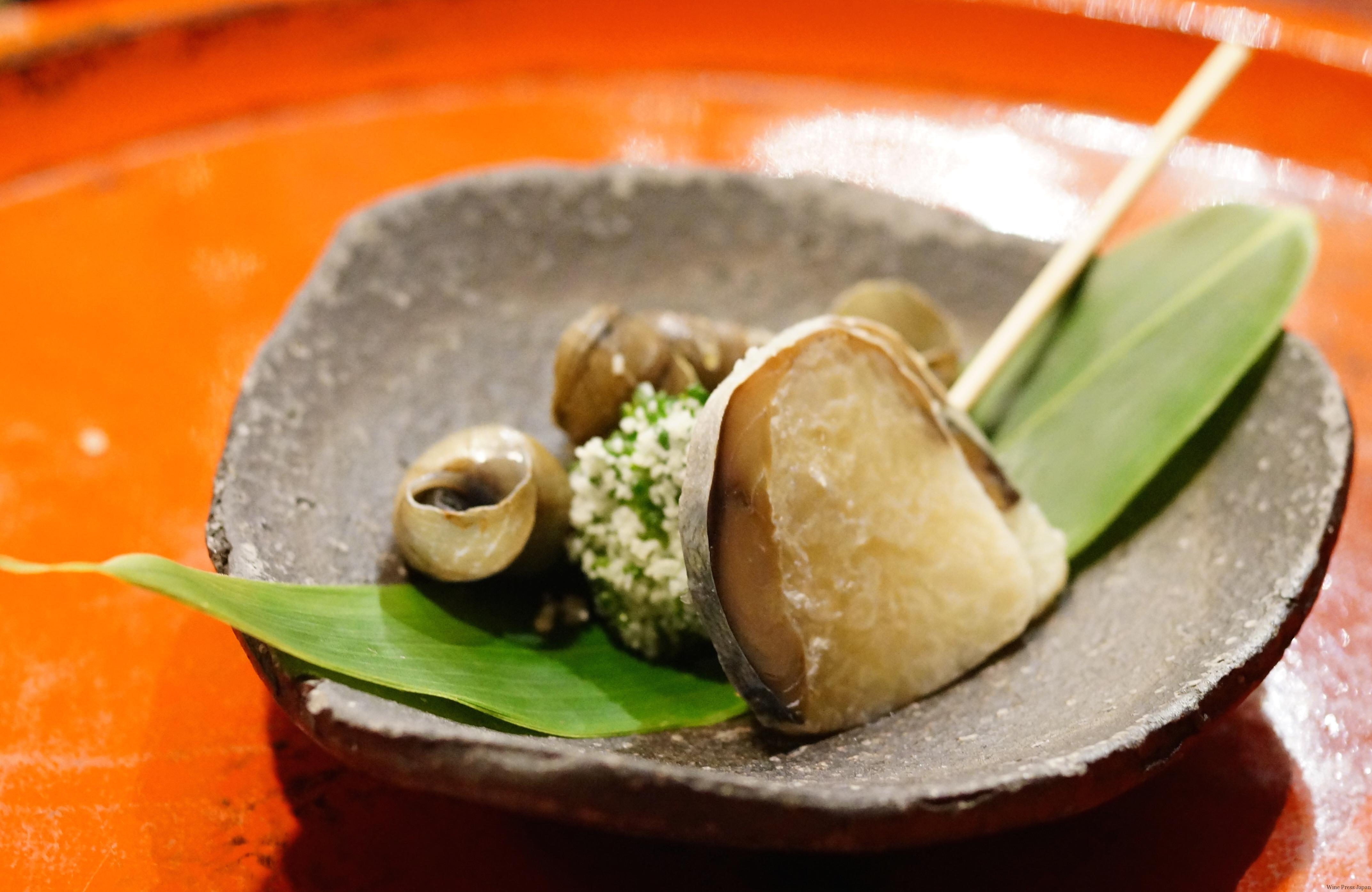 「八寸」の海サイドは、鰹生節と鯖鮨山椒葉巻。山サイドは、田芹湯葉八幡巻、ツタンカーメンという特殊な豆、虎杖(いたどり)川のり付など、盛りだくさんです。「グレイス トラディショナルメソッド エクストラブリュット 2009」のフレッシュ感となめらかな旨みとが、山椒のキリッとした風味、虎杖の甘酸っぱさ、田芹の香りと苦みなど、様々な要素をまろやかに立体的にしてくれます。