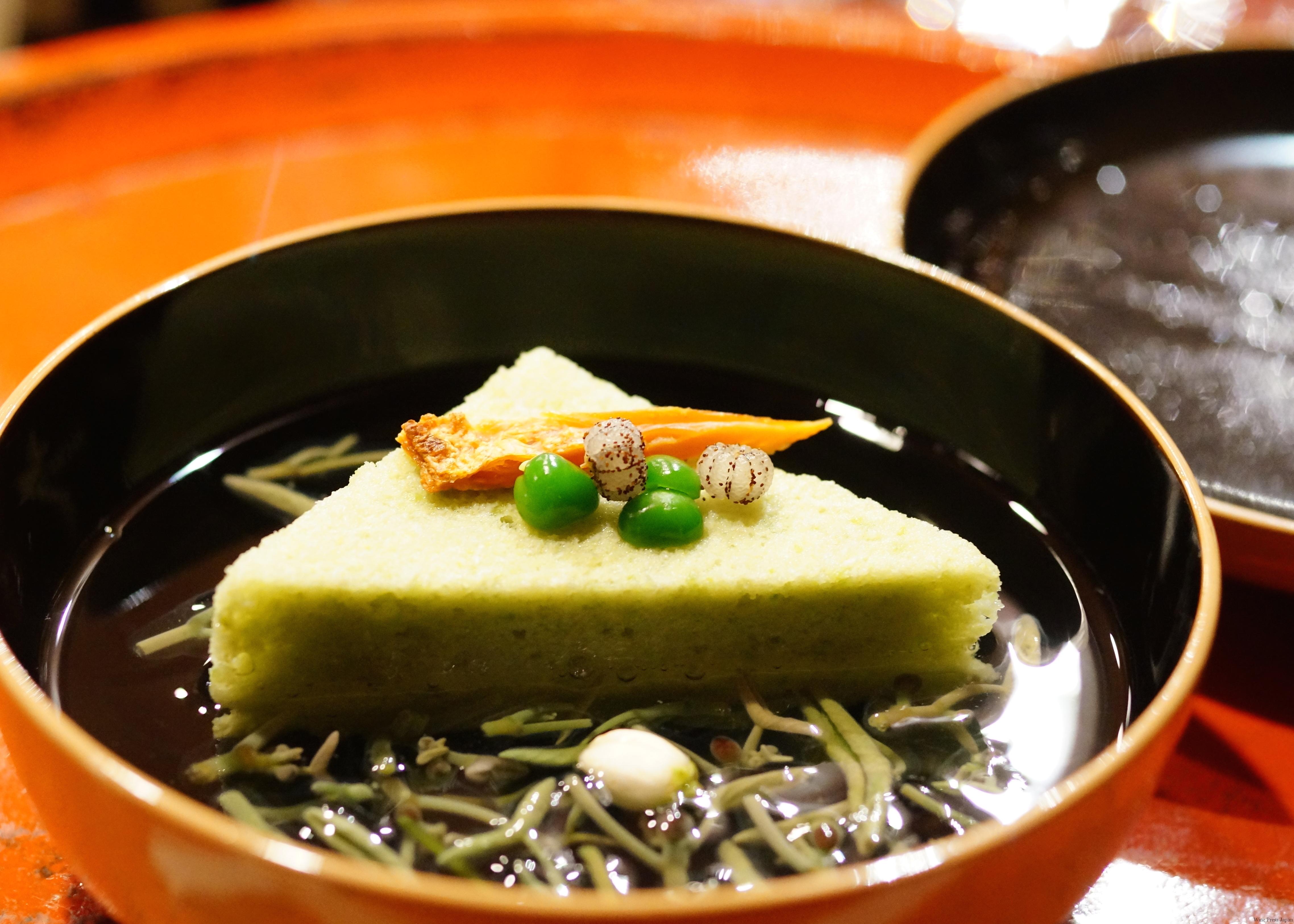 「煮物椀」は、エンドウ豆がふわりとした食感に仕立てられた豌豆(えんどう)水無月。ジュンサイの吸い物の上に水無月が浮かんで、岩梨という極小さな果実と、柚子の花一輪、バチコがのっています。甘いもの、香る苦みのあるもの、香ばしい塩味のもの。コントラストの楽しい一椀です。これも、既にお椀の中で完成しています。