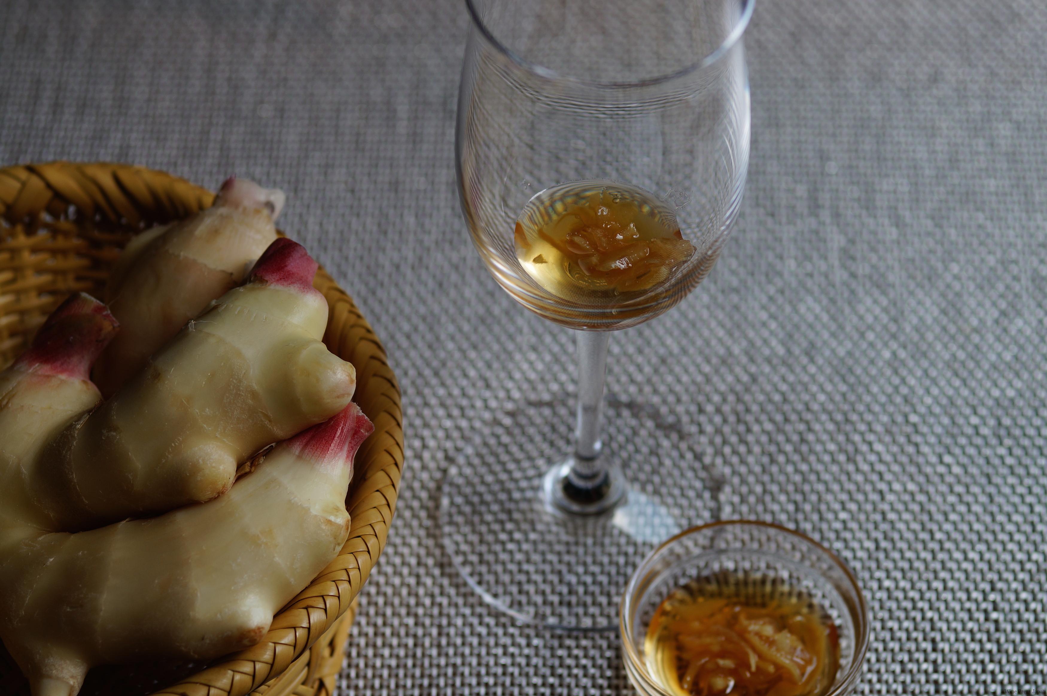 グラスに小さじ一杯分のシロップを生姜ごと入れて、スパークリングワインを注ぎ入れます。スパークリングワインは固形物があると泡立ちがよくなるので、溢れないように気をつけてくださいね。ただ、その分しばらく泡が綺麗に立ち続けるので見た目も楽しめます。三温糖を使ったので色が飴色になりましたが、グラニュー糖ならもう少し薄い色合いです。糖分が入るので、香りにふくらみが出て、味わいはもちろん甘味と生姜の爽やかさが適度に加わります。