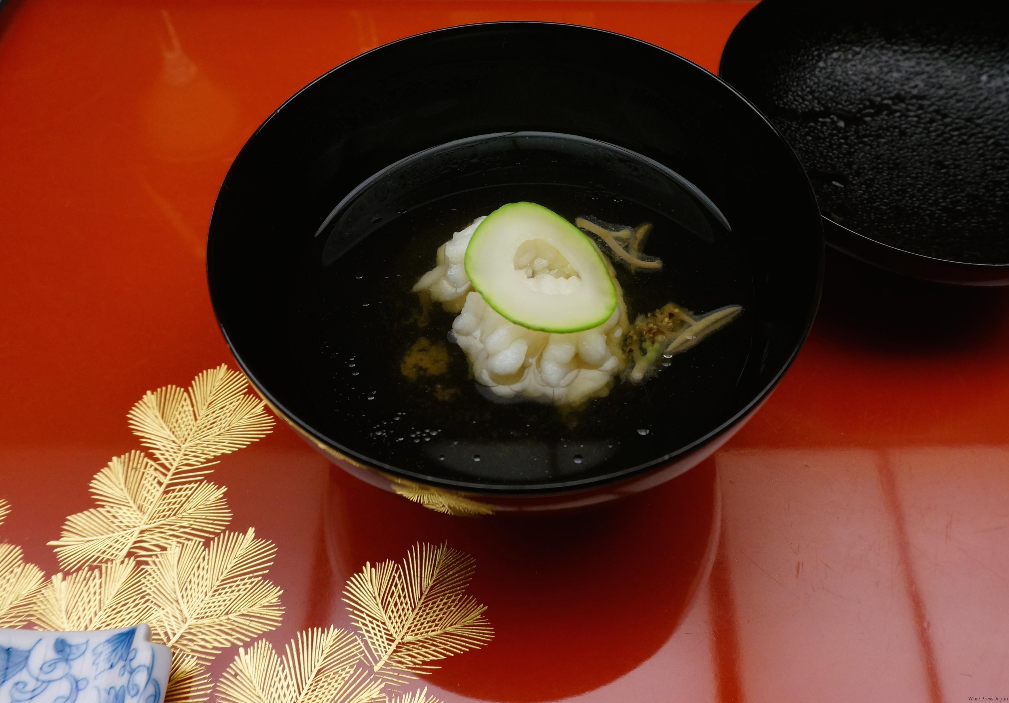 - 汁物はワインと難しいといわれますが、具だけ合わせてみるのも一手。これはハモです。