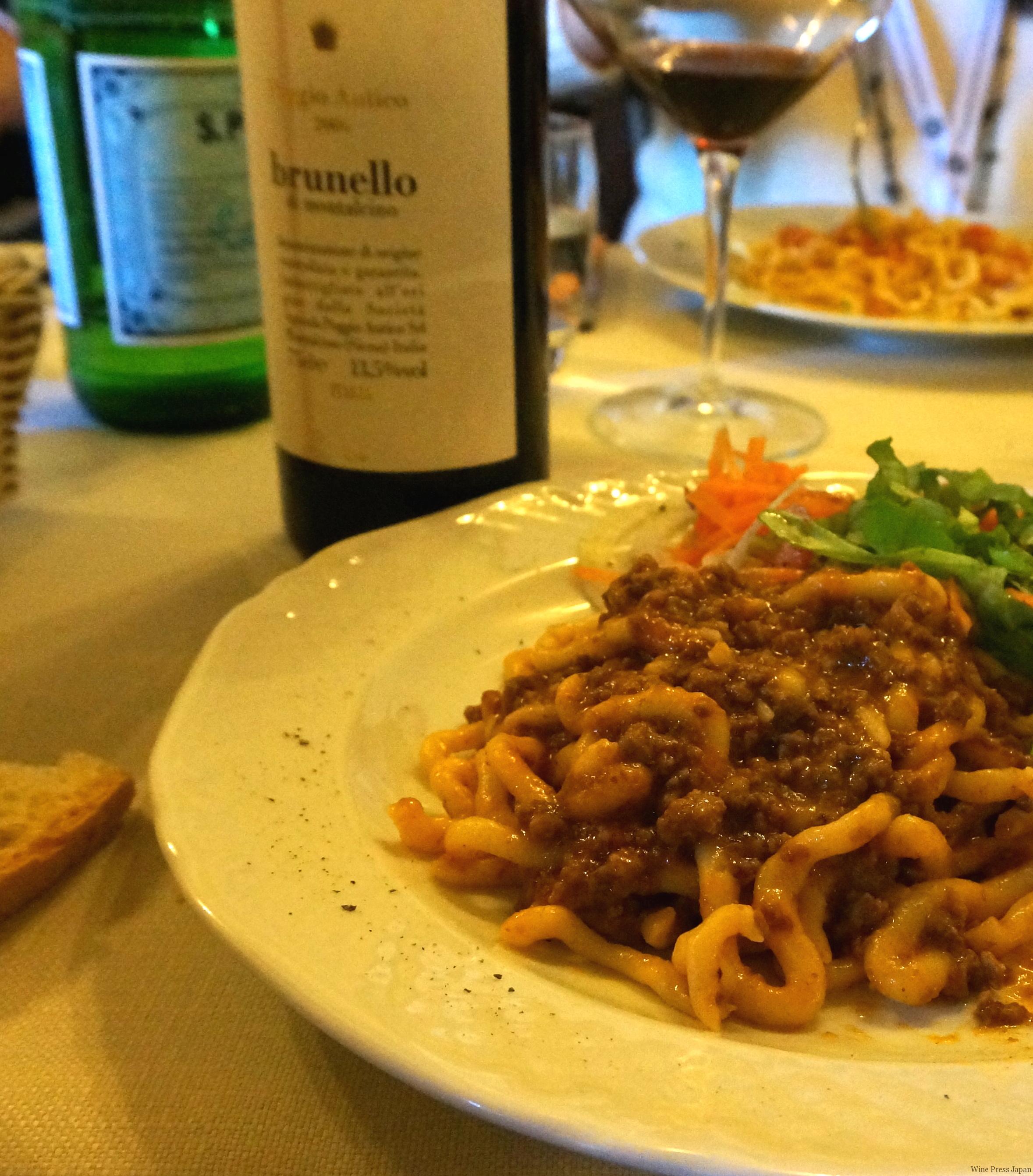 他の選択肢としては、トマトソースもありますし、最も伝統的なパン粉とオリーブオイルとパセリのふりかけをからめたものもあります。後者は、最初にモンタルチーノを訪問した時の「初」ピンチで食べました。造り手の「ヴァル・ディ・カーヴァ」のオーナーがご馳走してくれたのですが、「昔モンタルチーノは貧しい土地だったから、残り物のパンを使ってパスタの具にしていた名残がこれ」と教えてくれました。今はモンタルチーノもワイン景気で随分土地が値上がりして、新しく畑を買うのは相当難しいようです。