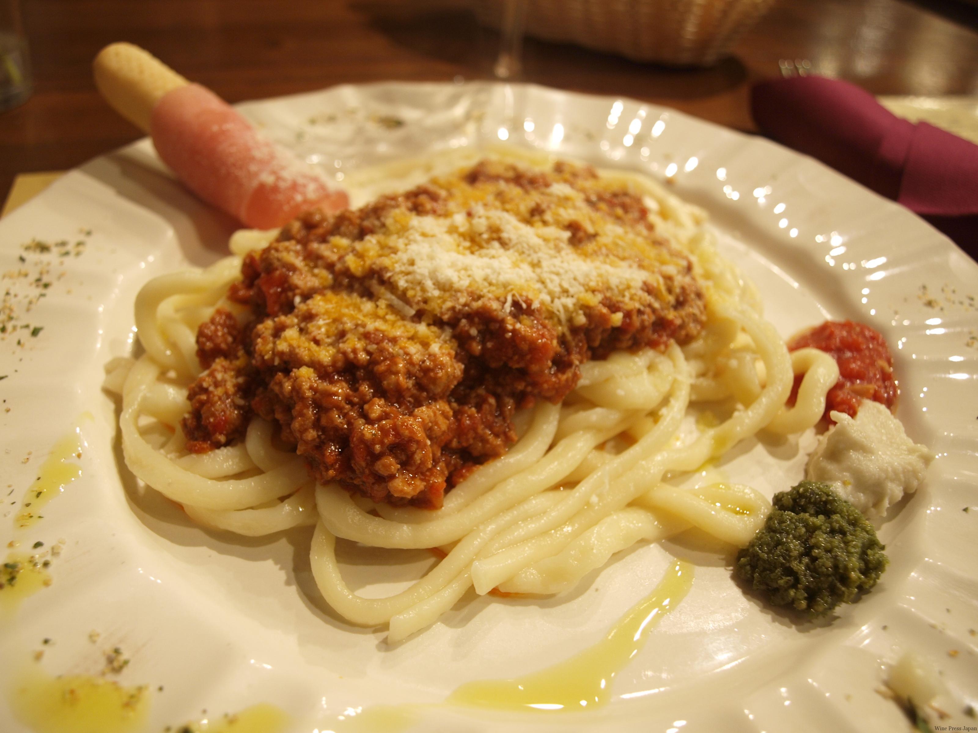 滞在中に一度は食べなくてはいけない、と勝手に決めているものがひとつあります。ピンチというパスタで、トスカーナの他の地域ではピーチと呼んでいるものです。乾麺も売っていますが、現地で食べるなら絶対生麺! 見た感じは日本のうどんそのもので、手打ちの讃岐うどんといった感じでしょうか。太くってむっちりとして、食べ応え充分です。これに、イノシシ肉のラグーソースとくれば、ブルネッロもロッソ・ディ・モンタルチーノも美味しく飲めます。