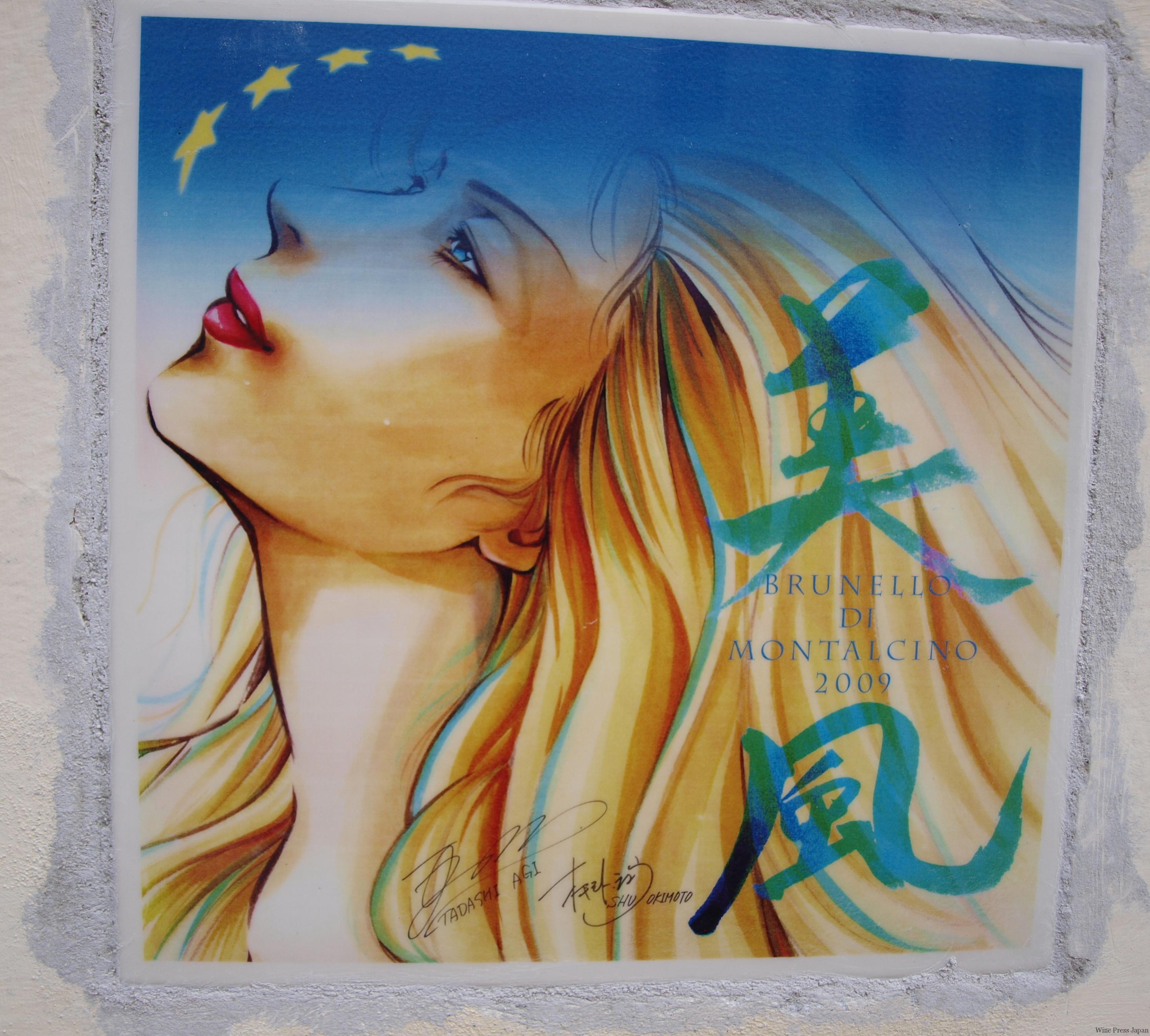 そして、もしモンタルチーノを訪れるなら見てきてください。街の中心部にある小さな広場の壁に、たくさんタイルが埋め込んであります。これはブドウの収穫状況を5つ星で表したもので、毎年生産者協会が画家や芸術家に依頼して描いてもらったものなのです。その中に、日本語で「美風」と書かれたタイルもあります。「神の雫」の原作者&漫画家による作品です。