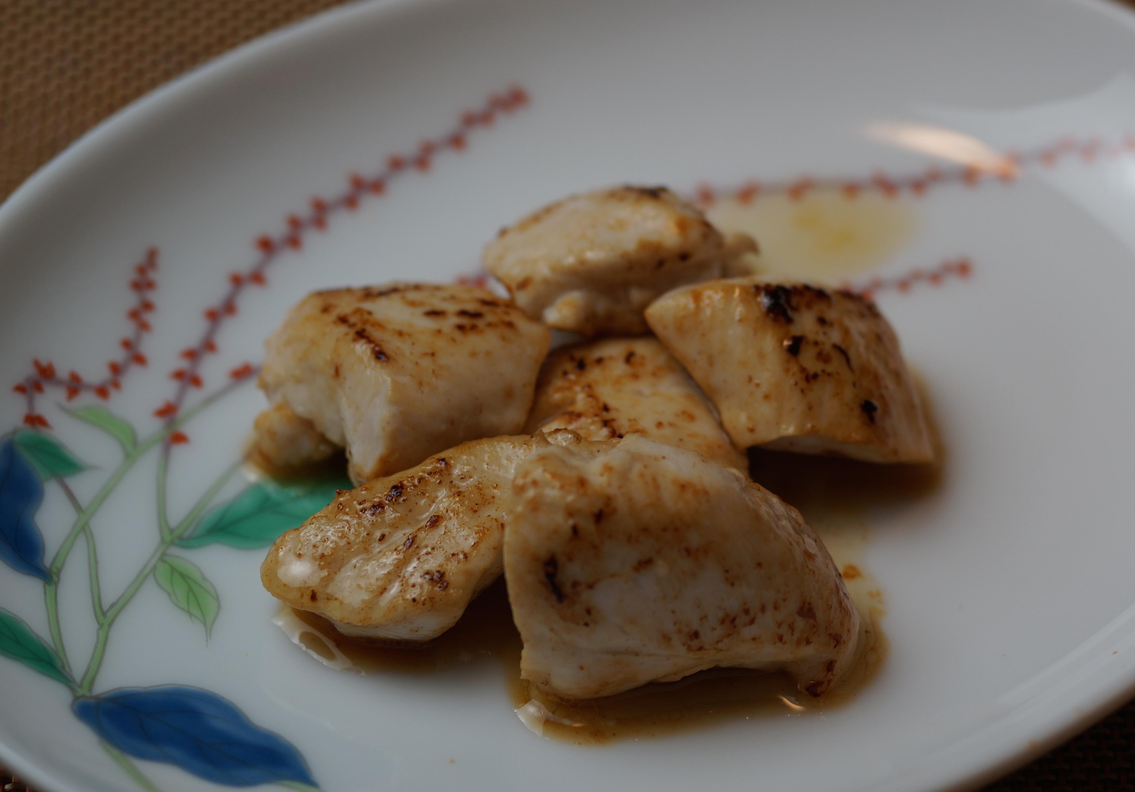 「パトリック・ジャヴィリエ」は、リッチな香りでオイリーな食感なので、やっぱりバターやクリームを使いたくなります。単純に比較するために、こちらはささ身肉をバターソテーにしてみました。ふっくら、こっくりとした相性です。もっと手をかける余裕があれば、鶏もも肉をバターソテーして白ワインソースなど、トライしてはいかがでしょうか。