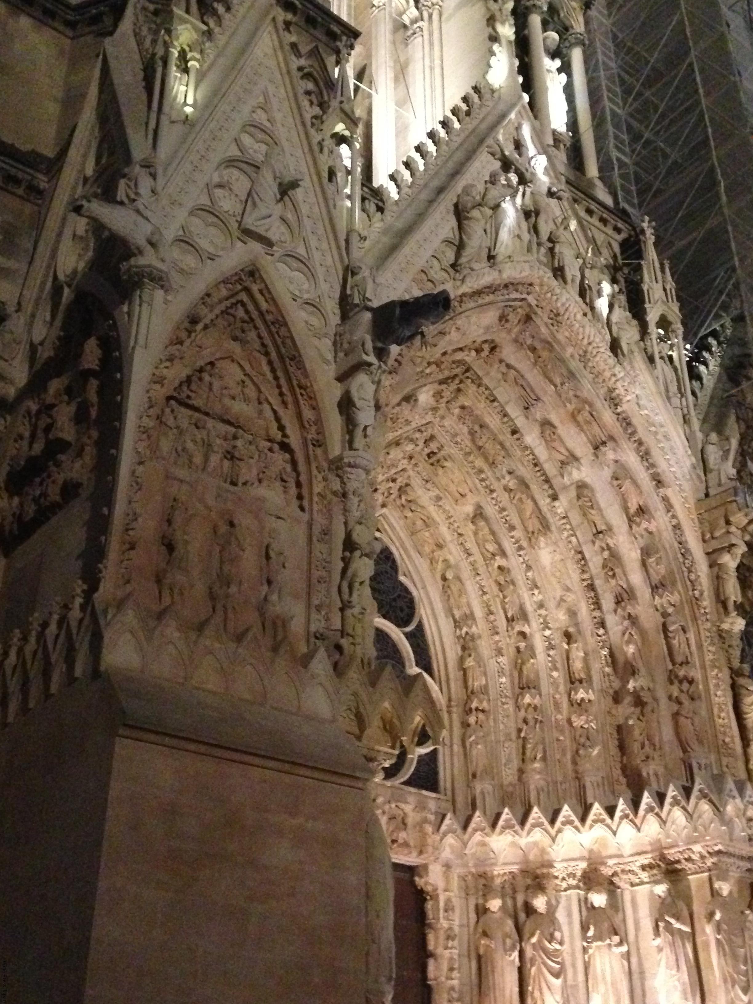 この大聖堂は、常にどこかしら修復しているようで、今春の訪問時には表参道から向かって行くと真正面に見えるメインの西正門が、まさに修復中で、残念なことに外側からは見ることができませんでした。ただ、荘厳な様子は他からも大いに感じ取れます。中に入ると、厚い石の壁に囲まれた空間はひんやりとしています。高い高い天井へ向かって、いくつもの柱が伸びている様子は、人々に天国の存在を想像とさせるものだったのでしょう。