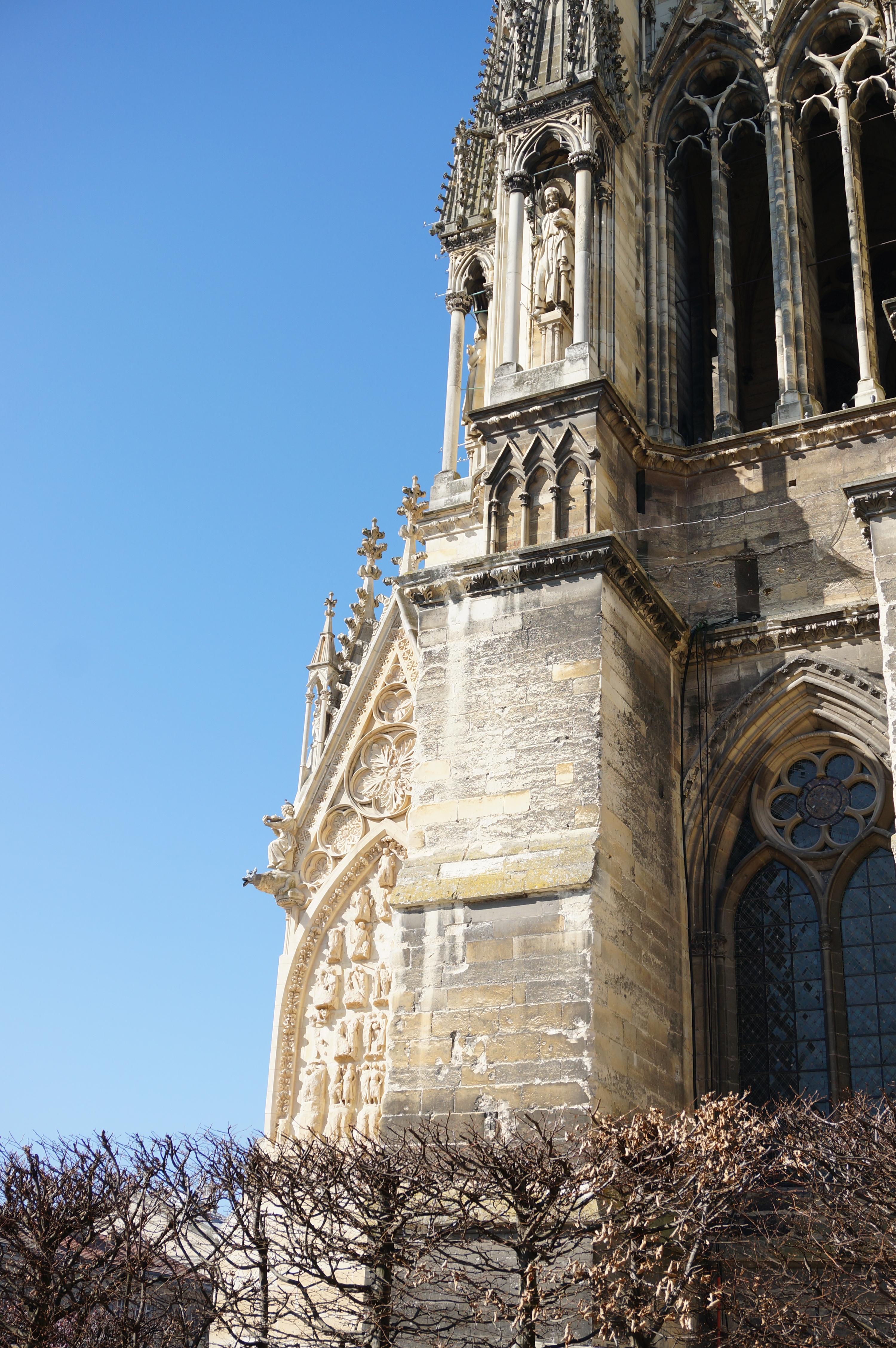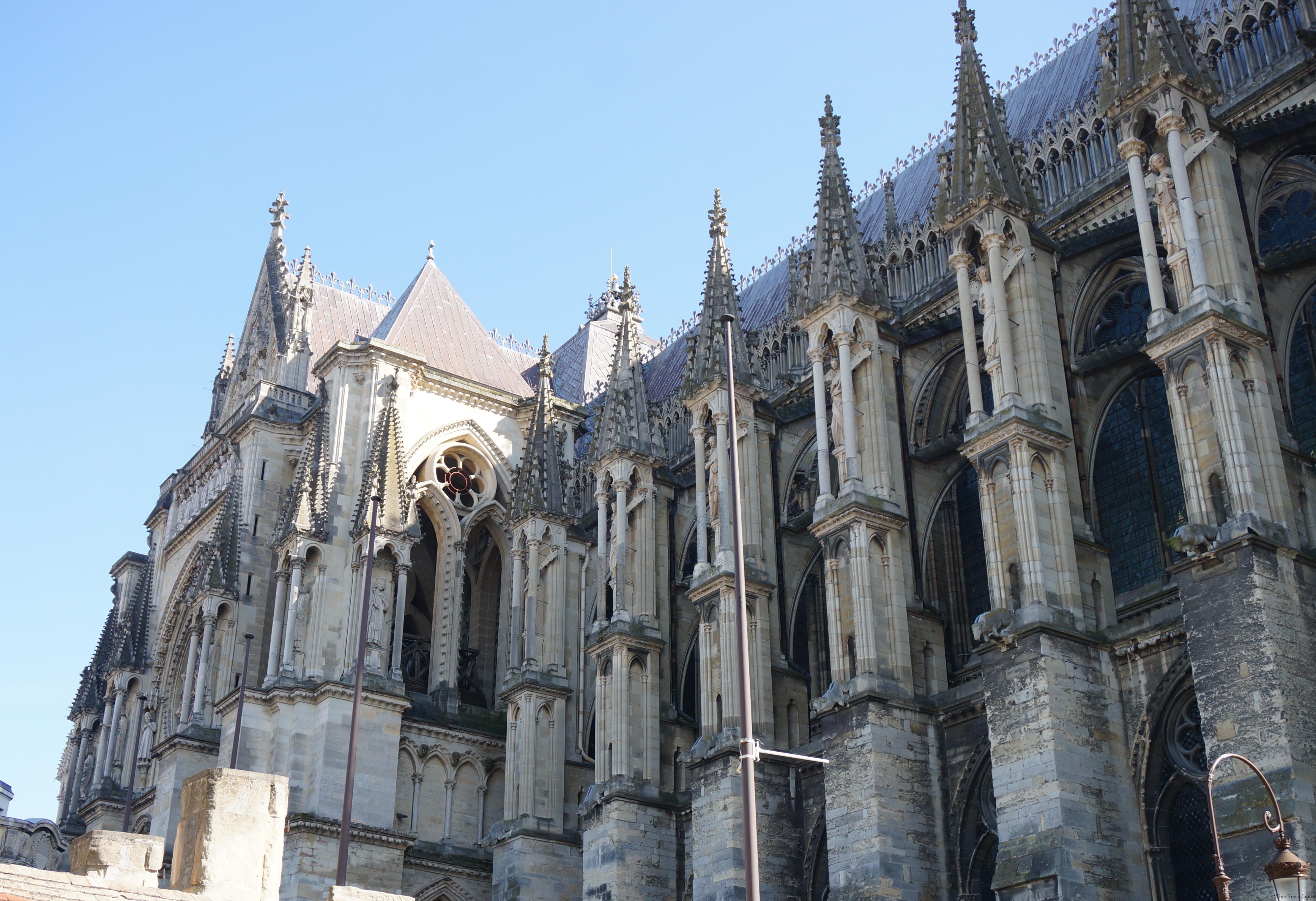 外観にも特徴があります。外壁に施された彫像は、合計で2,300体と膨大な数で、中でも「ほほえみの天使」と呼ばれる温かい表情の彫像が有名です。そして天井の高い建物を支える外壁の上の方を見上げると、たくさんの小さな塔が見られます。ピナクル(小尖塔)と呼ばれるものですが、その大きさや装飾がとても目立つ存在なのも、このランスのノートルダム大聖堂ならでは。