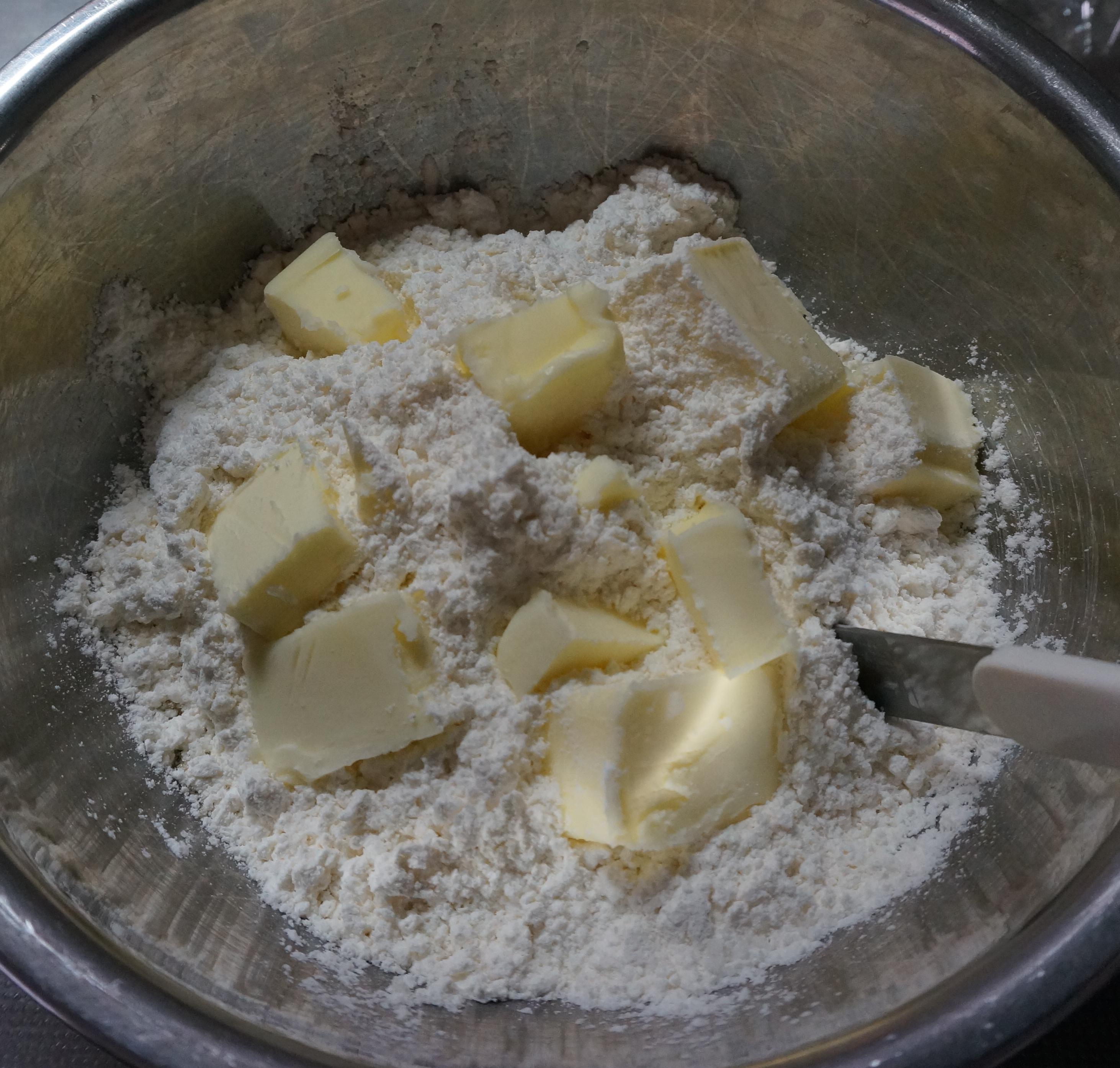 2 バターを指で「粉」あるいは「砂」のようにする(指で潰すと溶けてしまう心配があったので、手を使わずナイフでさらさらになるまで切り刻みました)。
