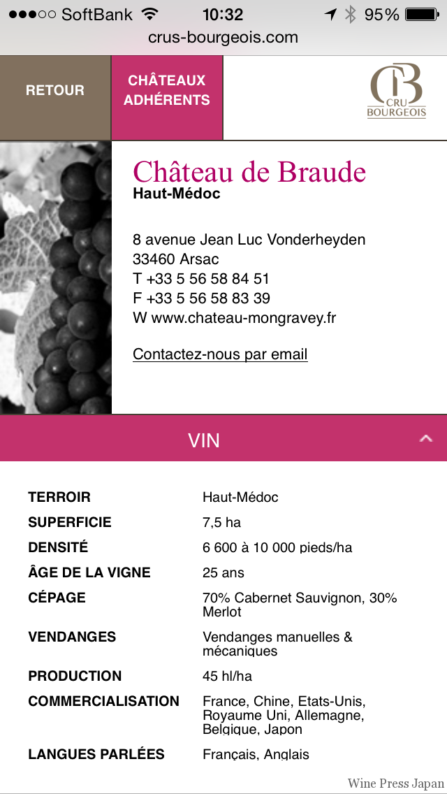 11年ヴィンテージにおいてクリュ・ブルジョワに認定されたのは256シャトーで、その生産量はメドック全体の30パーセントに当たります。認定されたシャトーには、クリュ・ブルジョワのステッカーが貼られるのですが、そのステッカーは認定されたキュヴェの生産量に応じて配布されるため、シャトーは水増し等の不正が出来ません。またステッカーには二次元コードがついていて、スマートホンでスキャンすると、クリュ・ブルジョワの公式サイトにある、該当シャトーの情報ページにアクセスすることができます。