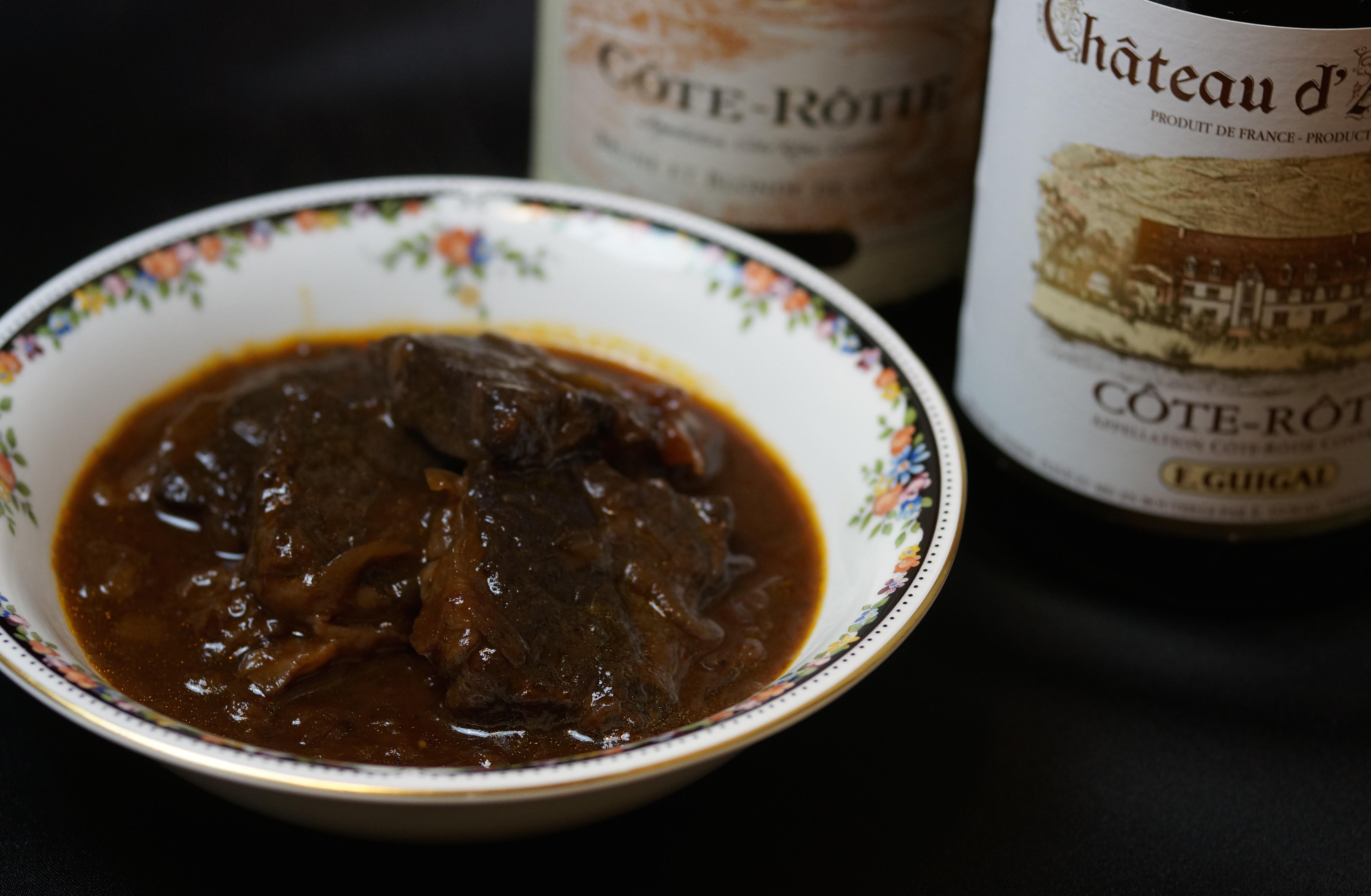 どちらもとっても力強いので、普段の食事では太刀打ちできそうにありません。一般的には、コート・ロティは冬のジビエに合わせることが多いワインです。例えば、鹿肉、山シギ、大きなウサギ、鴨肉など。しかも、レバーや血を用いたソースを添えて。でもこういう料理は、家族や友人に鉄砲打ちの人がいれば別ですが、たいていフランス料理屋さんに行かないとなかなか食べられないものです。
