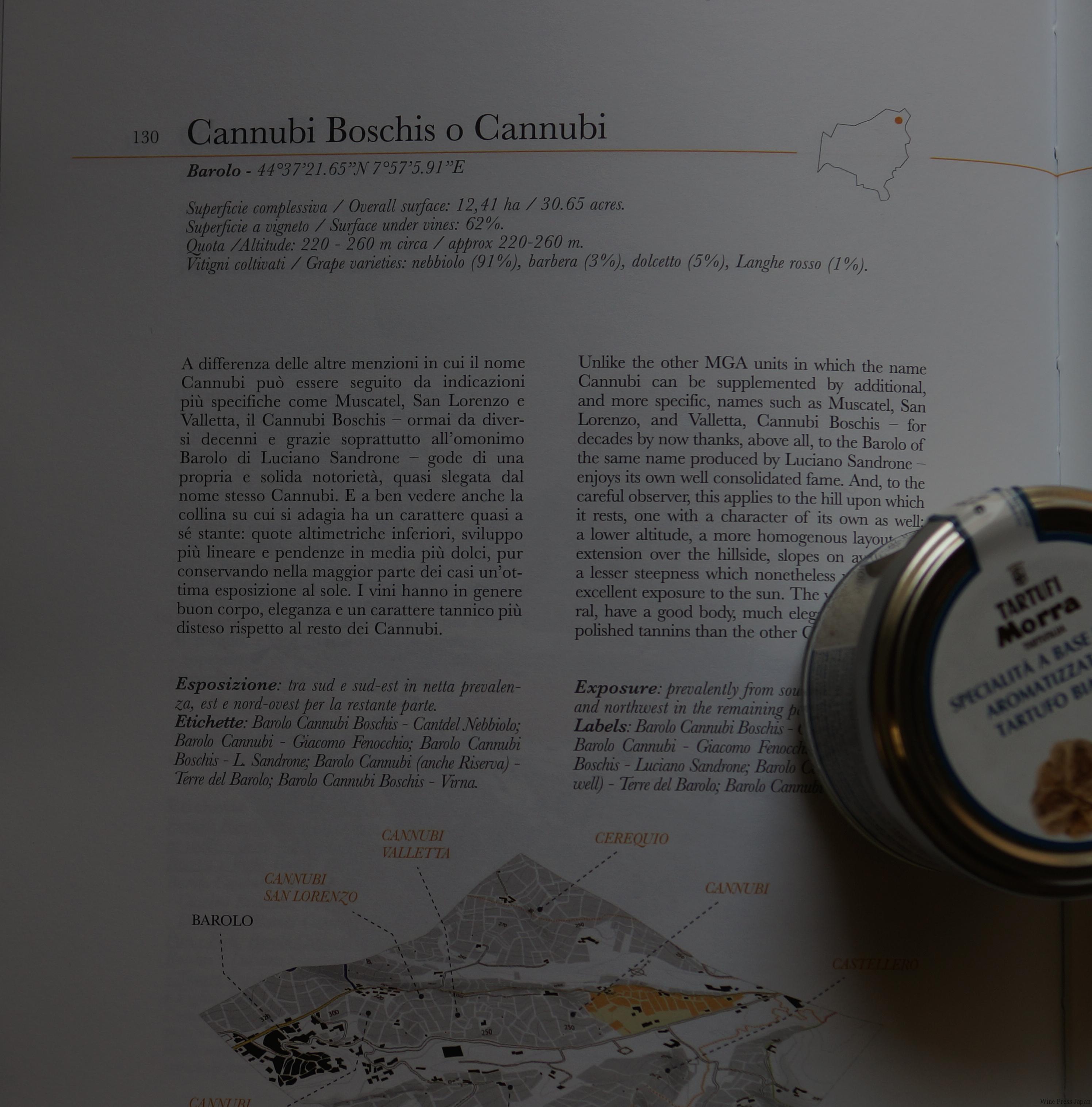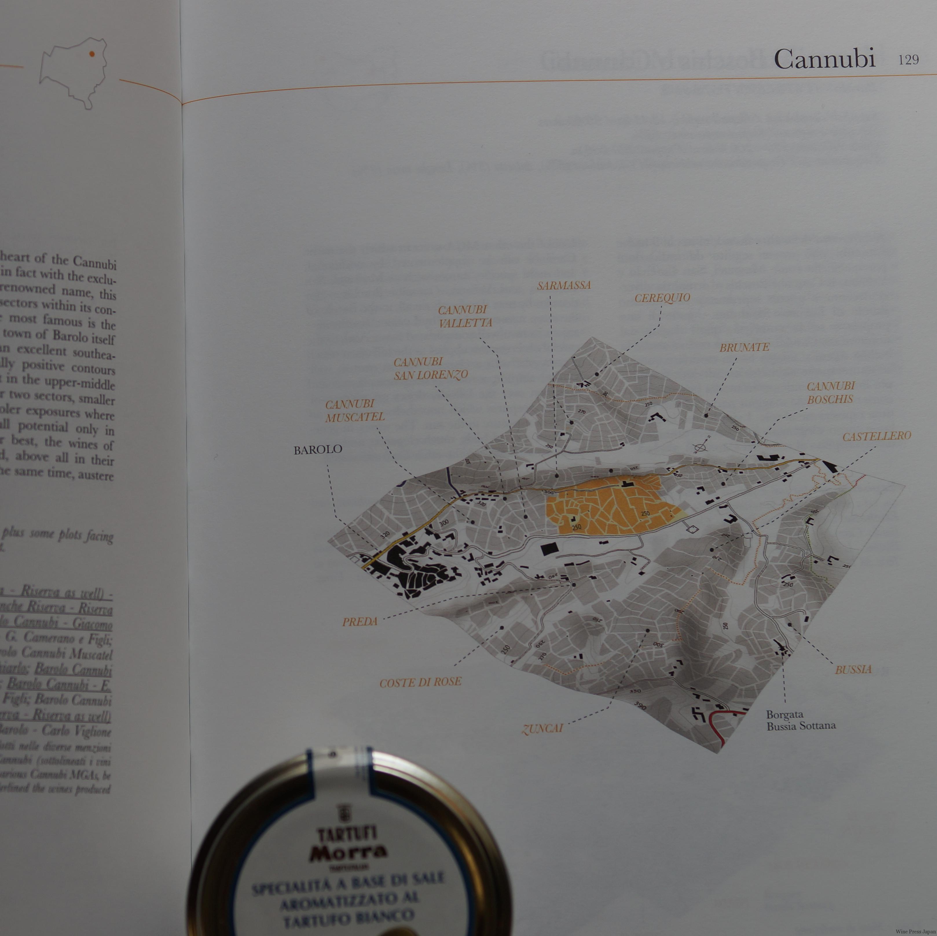 中を見て驚きました。バローロの概要、様々なデータはもとより、それぞれの畑の位置、3D的な地図、緯度、経度、標高、面積、栽培品種の割合、向き、その畑から生まれるワインの特徴、所有者の名前まで、記されています。しかも、イタリア語と英語の二カ国語ですから、助かります。
