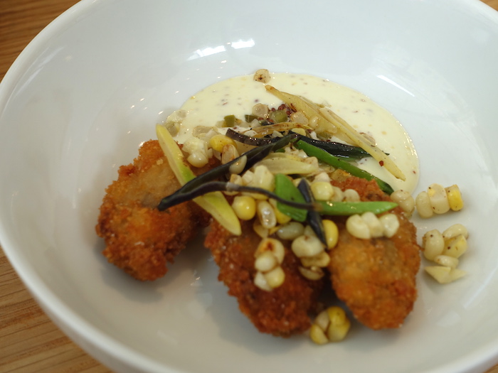 この日はケールサラダ(私はこれに目がなくて、米国滞在中は、あればどこでも必ず頼んでしまう!)、ホタテのガスパチョ仕立て、フライドオイスター、チェダーチーズのマッシュポテト、アーティチョークとブラックオリーブのフェットチーネ、ポークソーセージを頼んでみた。